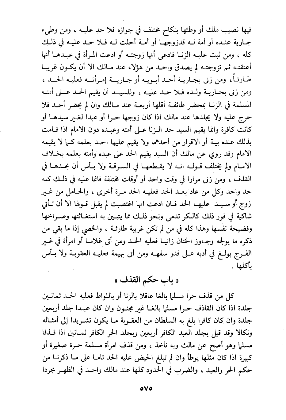 فيها نصيب ملك أو وطئها بنكاح مختلف في جوازه فلا حد عليه ومن وطىء جارية عنده أو أمة له قد زوجها أو أمة أحلت له فلا حد عليه في ذلك كله ومن ثبت عليه الزنا فادعى أنها زوجته أو أدعت المرأة في عبدها أنها أعتقته ثم تزوجته لم يصدق واحد من هؤلاء عند مالك الا أن يكون غريبا طارئا ومن زنى بجارية أحد أبويه أو جارية إمرأته فعليه الحد ومن زنى بجارية ولده فلا حد عليه وللسيد ان يقيم الحد على أمته المسلمة في الزنا بمحضر طائفة أقلها أربعة عند مالك وان لم يحضر أحد فلا حرج عليه ولا يجلدها عند مالك إذا كان زوجها حرا أو عبدا لغير سيدها أو كانت كافرة وإنما يقيم السيد حد الزنا على أمته وعبده دون الامام اذا قامت بذلك عنده بينة أو الاقرار من أحدهما ولا يقيم عليها الحد بعلمه كما لا يقيمه الامام وقد روي عن مالك أن السيد يقيم الحد على عبده وأمته بعلمه بخلاف الامام ولم يختلف قوله أنه لا يقطعها في السرقة ولا بأس أن يحدها في القذف ومن زنى مرارا في وقت واحد أو أوقات مختلفة فانما عليه في ذلك كله حد واحد وكل من عاد بعد الحد فعليه الحد مرة أخرى والحامل من غير زوج أو سيد عليها الحد فان ادعت انها اغتصبت لم يقبل قولها الا أن تأتي شاكية في فور ذلك كالبكر تدمى ونحو ذلك مما يتبين به استغاثتها وصراخها وفضيحة نفسها وهذا كله في من لم تكن غريبة طارئة والخصي إذا ما بقي من ذكره ما يولجه وجاوز الختان زانيا فعليه الحد ومن أتى غلاما أو امرأة في غير الفرج بولغ في أدبه على قد سفهه ومن أتى بهيمة فعليه العقوبة ولا بأس بأكلها باب حكم القذف كل من قذف حرا مسلما بالغا عاقلا بالزنا أو بالواط فعليه الحد ثمانين جلدة اذا كان القاذف حرا مسلما بالغا غير مجنون وان كان عبدا جلد أربعين جلدة وان كان كافرا بلغ به السلطان من العقوبة ما يكون تشريدا الى أمثاله ونكالا وقد قيل بجلد العبد الكافر أربعين وبجلد الحر الكافر ثمانين اذا قذفا مسلما وهو أصح عن مالك وبه نأخذ ومن قذف امرأة مسلمة حرة صغيرة أو كبيرة اذا كان مثلها يوطأ وان لم تبلغ الحيض عليه الحد تاما على ما ذكرنا من حكم الحر والعبد والضرب في الحدود كلها عند مالك واحد في الظهر مجردا