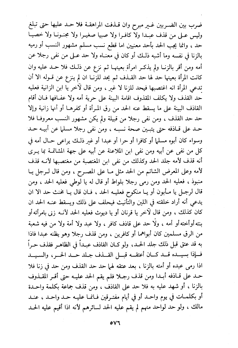 ضرب بين الضربين غير المبرح وان قذفت المراهقة فلا حد عليها حتى تبلغ وليس على من قذف عبدا ولا كافرا ولا صبيا صغيرا ولا مجنونا ولا خصيا حد وانما يجب الحد بأحد معنيين أما قطع نسب مسلم مشهور النسب أو رميه بالزنا في نفسه وما أشبه ذلك أو كان في معناه ولا حد على من نفى رجلا عن أمه ومن أقر بالزنا ولم يذكر امرأة بعينها ثم نزع عن ذلك فلا حد عليه وان كانت المرأة بعينها حد لها حد القذف ثم يحد للزنا ان لم ينزع عن قوله الا أن تدعي المرأة أنه اغتصبها فيحد للزنا لا غير ومن قال لآخر يا ابن الزانية فعليه حد القذف ولا يكلف المقذوف اقامة البينة على حرية أمه ولا عفافها فان أقام القاذف البينة على ما يسقط عنه الحد من رق المرأة أو كفرها أو أنها زانية وإلا حد حد القذف ومن نفى رجلا من قبيلة ولم يكن مشهور النسب معروفا فلا حد على قاذفه حتى يتبين صحة نسبه ومن نفى رجلا مسلما عن أبيه حد وسواء كان أبوه مسلما أو كافرا أو حرا أو عبدا أو غير ذلك يراعى حال أمه في كل من نفى عن أبيه ومن نفى ابن الملاعنة عن أبيه على جهة المشاتمة بما يرى أنه قذف لأمه جلد الحد وكذلك من نفى ابن المغتصبة من مغتصبها لأنه قذف لأمه وعلى المعرض الشاتم من الحد مثل ما على المصرح ومن قال لرجل يا منبوذ فعليه الحد ومن رمى رجلا بلواط أو قال له يا لوطي فعليه الحد ومن قال لرجل يا مأبون أو يا منكوح فعليه الحد فان قال يا مخنث حد الا أن يدعي انه أراد خلقته في اللين والتأنيث فيحلف على ذلك ويسقط عنه الحد ان كان كذلك ومن قال لآخر يا قرنان أو يا ديوث فعليه الحد لأنه زنى بامرأته أو بنته أو أخته أو أمه ولا حد على قاذف كافر ولا عبد ولا أمة ولا من فيه شعبة من الرق مسلمين كان أبواهما أو كافرين ومن قذف رجلا وهو يظنه عبدا فاذا به قد عتق قبل ذلك جلد الحد ولو كان القاذف عبدا في الظاهر فقذف حرا فإذا بسيده قد كان أعتقه قبل القذف جلد حد الحر والسيد اذا رمى عبده أو أمته بالزنا بعد عتقه لهما حد حد القذف ومن حد في زنا فلا حد على قاذفه أبدا ومن قذف رجلا فلم يقم الحد عليه حتى أقر المقذوف بالزنا أو شهد عليه به فلا حد على القاذف ومن قذف جماعة بكلمة واحدة أو بكلمات في يوم واحد أو في أيام مفترقين فإنما عليه حد واحد عند مالك ولو حد لواحد منهم لم يقم عليه الحد لسائرهم لأنه اذا أقيم عليه الحد