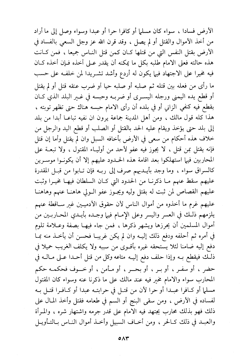 الأرض فسادا سواء كان مسلما أو كافرا حرا أو عبدا وسواء وصل الى ما أراد من أخذ الأموال والقتل او لم يصل وقد قرن الله عز وجل السعي بالفساد في الأرض بقتل النفس التي من قتلها كان كمن قتل الناس جميعا فمن كانت هذه حالته فعلى الامام طلبه بكل ما يمكنه ان يقدر على أخذه فإن أخذه كان فيه مخيرا على الاجتهاد فيما يكون له أردع وأشد تشريدا لمن خلفه على حسب ما رأى من فعله بين قتله ثم صلبه أو صلبه حيا أو ضرب عنقه قتل أو لم يقتل أو قطع يده اليمنى ورجله اليسرى او ضربه وحبسه في غير البلد الذي كان يقطع فيه كنفي الزاني أو في بلده أن رأى الامام حبسه هناك حتى تظهر توبته هذا كله قول مالك ومن أهل المدينة جماعة يرون ان نفيه تباعا أبدا من بلد الى بلد حتى يؤخذ ويقام عليه الحد بالقتل أو الصلب أو قطع اليد والرجل من خلاف هذه أحكام من سعى في الأرض بأخافه السبل وان لم يقتل وأما إن قتل فإنه يقتل بمن قتل لا يجوز فيه عفو لأحد من أولياء المقتول ولا تبعة على المحاربين فيما استهلكوا بعد إقامة هذه الحدود عليهم إلا أن يكونوا موسرين كالسراق سواء وما وجد بأيديهم صرف الى ربه فإن تابوا من قبل المقدرة عليهم سقط عنهم ما ذكرنا من الحدود التي كان السلطان فيها مخيرا وثبت عليهم القصاص لمن ثبت له بقتل وليه ويجوز عفو الولي هاهنا عنهم وهاهنا عليهم غرم ما أخذوه من أموال الناس لأن حقوق الآدميين غير ساقطة عنهم يلزمهم ذلك في العسر واليسر وعلى الإمام فيما وجده بأيدي المحاربين من أموال المسلمين ان يحرزها ويشهر ذكرها فمن جاء فيها بصفة وعلامة تلوم في امره ثم أحلفه ودفع ذلك إليه وإن لم يكن غريبا فحسن أن يأخذ منه بما دفع إليه ضامنا لئلا يستحقه غيره بأقوى من سببه ولا يكلف الغريب جميلا في ذلك فيقطع به وإذا حلف دفع إليه متاعه وكل من قتل أحدا على ماله في حضر أو سفر أو بر أو بحر أو مأمن أو خوف فحكمه حكم المحارب سواء والامام مخير فيه عند مالك على ما ذكرنا عنه وسواء كان المقتول مسلما أو كافرا عبدا أو حرا لأن من قتل في حرابته عبدا او كافرا قتل به لفساده في الأرض ومن سقى البنج أو السم في طعامه فقتل واخذ المال على ذلك فهو بذلك محارب يجتهد فيه الامام على قدر جرمه واشتهار شره والمرأة والعبد في ذلك كالحر ومن أخاف السبيل وأخذ أموال الناس بالتأويل