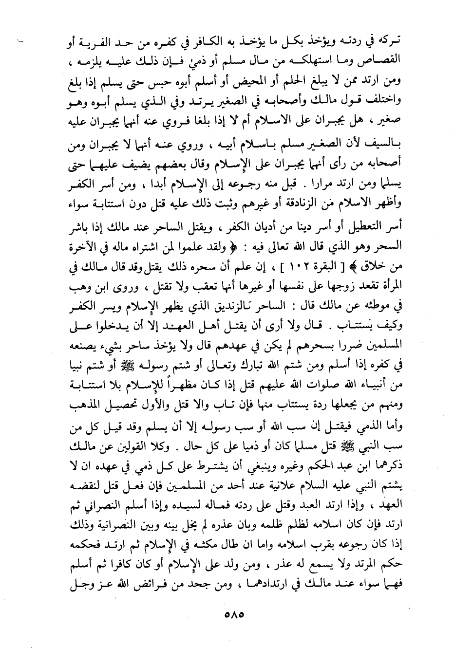 تركه في ردته ويؤخذ بكل ما يؤخذ به الكافر في كفره من حد الفرية أو القصاص وما استهلكه من مال مسلم أو ذمي فإن ذلك عليه يلزمه ومن ارتد ممن لا يبلغ الحلم أو المحيض أو أسلم أبوه حبس حتى يسلم إذا بلغ واختلف قول مالك وأصحابه في الصغير يرتد وفي الذي يسلم أبوه وهو صغير هل يجبران على الاسلام أم لا إذا بلغا فروي عنه أنهما يجبران عليه بالسيف لأن الصغير مسلم باسلام أبيه وروي عنه أنهما لا يجبران ومن أصحابه من رأى أنهما يجبران على الإسلام وقال بعضهم يضيف عليهما حتى يسلما ومن ارتد مرارا قبل منه رجوعه الى الإسلام أبدا ومن أسر الكفر وأظهر الاسلام من الزنادقة أو غيرهم وثبت ذلك عليه قتل دون استتابة سواء أسر التعطيل أو أسر دينا من أديان الكفر ويقتل الساحر عند مالك إذا باشر السحر وهو الذي قال الله تعالى فيه ولقد علموا لمن اشتراه ماله في الآخرة من خلاق البقرة إن علم أن سحره ذلك يقتل وقد قال مالك في المرأة تقعد زوجها على نفسها أو غيرها أنها تعقب ولا تقتل وروى ابن وهب في موطئه عن مالك قال الساحر كالزنديق الذي يظهر الإسلام ويسر الكفر وكيف يستتاب قال ولا أرى أن يقتل أهل العهد إلا أن يدخلوا على المسلمين ضررا بسحرهم لم يكن في عهدهم قال ولا يؤخذ ساحر بشيء يصنعه في كفره إذا أسلم ومن شتم الله تبارك وتعالى أو شتم رسوله صلى الله عليه وسلم أو شتم نبيا من أنبياء الله صلوات الله عليهم قتل إذا كان مظهرا للإسلام بلا استتابة ومنهم من يجعلها ردة يستتاب منها فإن تاب والا قتل والأول تحصيل المذهب واما الذمي فيقتل إن سب الله أو سب رسوله إلا أن يسلم وقد قيل كل من سب النبي صلى الله عليه وسلم قتل مسلما كان أو ذميا على كل حال وكلا القولين عن مالك ذكرهما ابن عبدالحكم وغيره وينبغي أن يشترط على كل ذمي في عهده ان لا يشتم النبي عليه السلام علانية عند أحد من المسلمين فإن فعل قتل لنقضه العهد وإذا ارتد العبد وقتل على ردته فماله لسيده وإذا أسلم النصراني ثم ارتد فإن كان اسلامه لظلم ظلمه وبان عذره لم يخل بينه وبين النصرانية وذلك إذا كان رجوعه بقرب اسلامه وأما ان طال مكثه في الإسلام ثم ارتد فحكمه حكم المرتد ولا يسمع له عذر ومن ولد على الإسلام أو كان كافرا ثم أسلم فهما سواء عند مالك في ارتدادهما ومن جحد من فرائض الله عزوجل