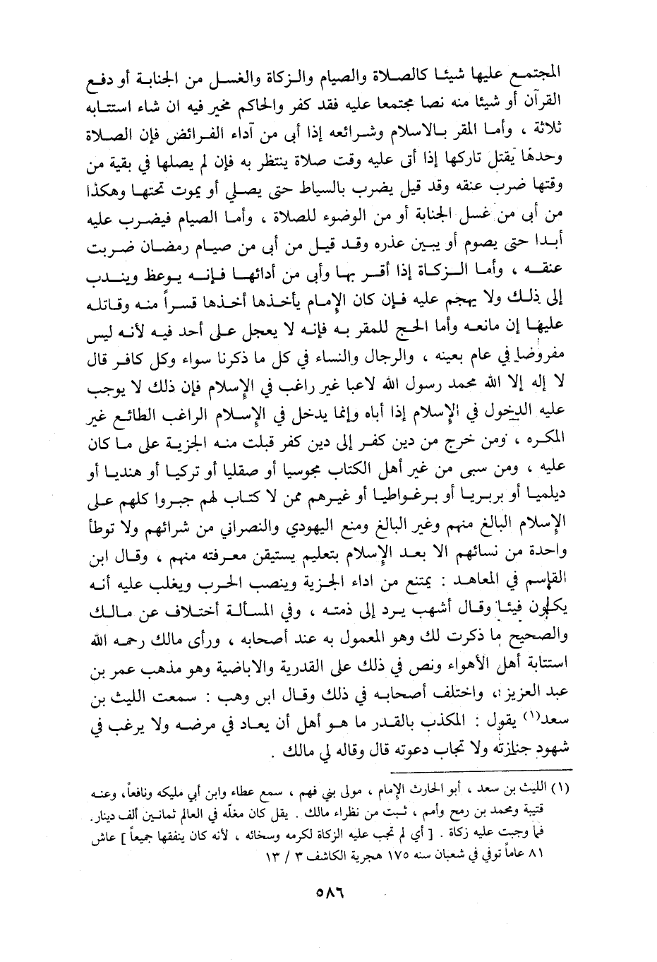 المجتمع عليها شيئا كالصلاة والصيام والزكاة والغسل من الجنابة أو دفع القرآن أو شيئا منه نصا مجتمعا عليه فقد كفر والحاكم مخير فيه ان شاء استتابه ثلاثة وأما المقر بالإسلام وشرائعه إذا أبى من آداء الفرائض فإن الصلاة وحدها يقتل تاركها إذا أتى عليه وقت صلاة ينتظر به فإن لم يصلها في بقية من وقتها ضرب عنقه وقد قيل يضرب بالسياط حتى يصلي أو يموت تحتها وهكذا من أبى من غسل الجنابة أو من الوضوء للصلاة وأما الصيام فيضرب عليه أبدا حتى يصوم أو يبين عذره وقد قيل من أبى من صيام رمضان ضربت عنقه وأما الزكاة إذا أقر بها وأبى من أدائها فإنه يوعظ ويندب إلى ذلك ولا يهجم عليه فإن كان الإمام يأخذها أخذها قسرا منه وقاتله عليها إن مانعه وأما الحج للمقر به فإنه لا يعجل على أحد فيه لأنه ليس مفروضا في عام بعينه والرجال والنساء في كل ما ذكرنا سواء وكل كافر قال لا إله الا الله محمد رسول الله لاعبا غير راغب في الإسلام فإن ذلك لا يوجب عليه الدخول في الإسلام إذا اباه وإنما يدخل في الإسلام الراغب الطائع غير المكره ومن خرج من دين كفر إلى دين كفر قبلت منه الجزية على ما كان عليه ومن سبى من غير أهل الكتاب مجوسيا أو صقليا أو تركيا أو هنديا أو ديلميا أو بربريا أو برغواطيا أو غيرهم ممن لا كتاب لهم جبروا كلهم على الإسلام البالغ منهم وغير البالغ ومنع اليهودي والنصراني من شرائهم ولا توطأ واحدة من نسائهم الا بعد الاسلام بتعليم يستيقن معرفته منهم وقال ابن القاسم في المعاهد يمتنع من اداء الجزية وينصب الحرب ويغلب عليه أنه يكون فيئا وقال أشهب يرد إلى ذمته وفي المسألة أختلاف عن مالك والصحيح ما ذكرت لك وهو المعمول به عند أصحابه ورأى مالك رحمه الله استتابة أهل الأهواء ونص في ذلك على القدرية والاباضية وهو مذهب عمر بن عبدالعزيز واختلف أصحابه في ذلك وقال ابن وهب سمعت الليث بن سعد يقول المكذب بالقدر ما هو أهل أن يعاد في مرضه ولا يرغب في شهود جنازته ولا تجاب دعوته قال وقاله لي مالك