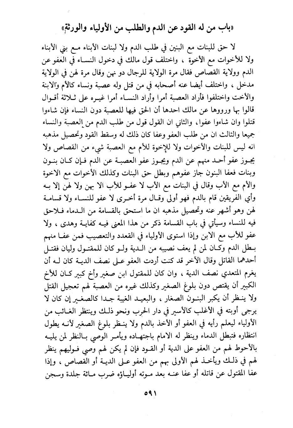 باب من له القود عن الدم والطلب من الأولياء والورثة لاحق للبنات مع البنين في طلب الدم ولا لبنات الأبناء مع بني الأبناء ولا للأخوات مع الاخوة واختلف قول مالك في دخول النساء في العفو عن الدم وولاية القصاص فقال مرة الولاية للرجال دونهن وقال مرة لهن في الولاية مدخل واختلف أيضا عنه أصحابه في من قتل وله عصبة ونساء كالأم والابنة والأخت واختلفوا فأراد العصبة أمرا وأراد النساء أمرا غيره على ثلاثة أقوال قالوا بها ورووها عن مالك احدها ان الحق فيها للعصبة دون النساء فإن شاءوا قتلوا وان شاءوا عفوا والثاني ان القول قول من طلب الدم من العصبة والنساء جميعا والثالث ان من طلب العفو وعفا كان ذلك له وسقط القود وتحصيل مذهبه انه ليس للبنات والاخوات ولا للإخوة للأم مع العصبة شيء من القصاص ولا يجوز عفو أحد منهم عن الدم ويجوز عفو العصبة عن الدم فإن كان بنون وبنات فعفا البنون جاز عفوهم وبطل حق البنات وكذلك الأخوات مع الاخوة والأم مع الأب وقال في البنات مع الأب لا عفو للأب الا بهن ولا لهن الا به وأي الفريقين قام بالدم فهو أولى وقال مرة أخرى لا عفو للنساء ولا قسامة لهن وهو أشهر عنه وتحصيل مذهبه ان ما استحق بالقسامة من الدماء فلا حق فيه للنساء وسيأتي في باب القسامة ذكر من هذا المعنى فيه كفاية وهدى ولا عفو للأب مع الابن وإذا استوى الاولياء في القعد والتعصيب فمن عفا منهم بطل الدم وكان لمن لم يعف نصيبه من الدية ولو كان للمقتول وليان فقتل أحدهما القاتل وقال الآخر قد كنت أردت العفو على نصف الدية كان له أن يغرم المتعدي نصف الدية وان كان للمقتول ابن صغير وأخ كبير كان للأخ الكبير أن يقتص دون بلوغ الصغير وكذلك غيره من العصبة لهم تعجيل القتل ولا ينظر أن يكبر البنون الصغار والبعيد الغيبة جدا كالصغير إن كان لا يرجى أوبته في الأغلب كالأسير في دار الحرب ونحو ذلك وينتظر الغائب من الأولياء ليعلم رأيه في العفو أو الأخذ بالدم ولا ينظر بلوغ الصغير لأنه يطول انتظاره فتبطل الدماء وينظر له الامام باجتهاده ويأمر الوصي بالنظر لمن يليه بالأحوط لهم من العفو على الدية أو القود فإن لم يكن لهم وصي فوليهم ينظر لهم في ذلك ويأخذ لهم الأولى بهم من العفو على الدية أو القصاص وإذا عفا المقتول عن قاتله أو عفا عنه بعد موته أولياءه ضرب مائة جلدة وسجن