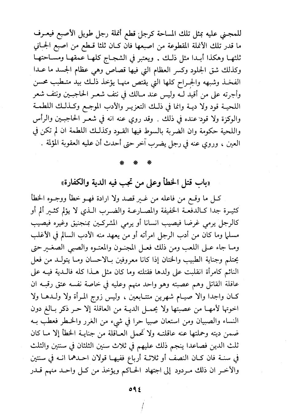 للمجني عليه بمثل تلك المساحة كرجل قطع أنملة رجل طويل الاصبع فيعرف ما قدر تلك الأنملة المقطوعة من اصبعها فان كان ثلثا قطع من اصبع الجاني ثلثها وهكذا أبدا مثل ذلك ويعتبر في الشجاج كلها عمقها ومساحتها وكذلك شق الجلود وكسر العظام التي فيها قصاص وهي عظام الجسد ما عدا الفخذ وشبهه والجراح كلها التي يقتص منها يؤخذ ذلك بيد متطبب محسن وأجرته على من أقيد له وليس عند مالك في نتف شعر الحاجبين ونتف شعر اللحية قود ولا دية وإنما في ذلك التعزيز والأدب الموجع وكذلك اللطمة والوكزة ولا قود عنده في ذلك وقد روي عنه انه في شعر الحاجبين والرأس واللحية حكومة وان الضربة بالسوط فيها القود وكذلك اللطمة ان لم تكن في العين وروي عنه في رجل يضرب آخر حتى أحدث أن عليه العقوبة المؤلمة باب قتل الخطأ وعلى من تجب فيه الدية والكفارة كل ما وقع من فاعله من غير قصد ولا ارادة فهو خطأ ووجوه الخطأ كثيرة جدا كالدفعة الخفيفة والمصارعة والضرب الذي لا يؤلم كثير ألم أو كالرجل يرمي غرضا فيصيب انسانا أو يرمي المشركين بمجنيق وغيره فيصيب مسلما وما كان من أدب الرجل امرأته أو من يعهد منه الأدب السالم في الأغلب وما جاء على اللعب ومن ذلك فعل المجنون والمعتوه والصبي الصغير حتى يحتلم وجناية الطبيب والختان إذا كانا معروفين بالاحسان وما يتولد من فعل النائم كامرأة انقلبت على ولدها فقتله وما كان مثل هذا كله فالدية فيه على عاقلة القاتل وهم عصبته وهو واحد منهم وعليه في خاصة نفسه عتق رقبة ان كان واجدا والا صيام شهرين متتابعين وليس زوج المرأة ولا ولدها ولا أخوتها لأمها من عصبتها ولا يحمل الدية من العاقلة الا حر ذكر بالغ دون النساء والصبيان ومن استعان صبيا حرا في شيء من الغرر والخطر فعطب به ضمن ديته وحملتها عنه عاقلته ولا تحمل العاقلة من جناية الخطأ إلا ما كان ثلث الدين فصاعدا يتجم ذلك عليهم في ثلاث سنين الثلثان في سنتين والثلث في سنة فان كان النصف أو ثلاثة أرباع ففيها قولان احدهما انه في سنتين والآخر ان ذلك مردود الى اجتهاد الحاكم ويؤخذ من كل واحد منهم قدر