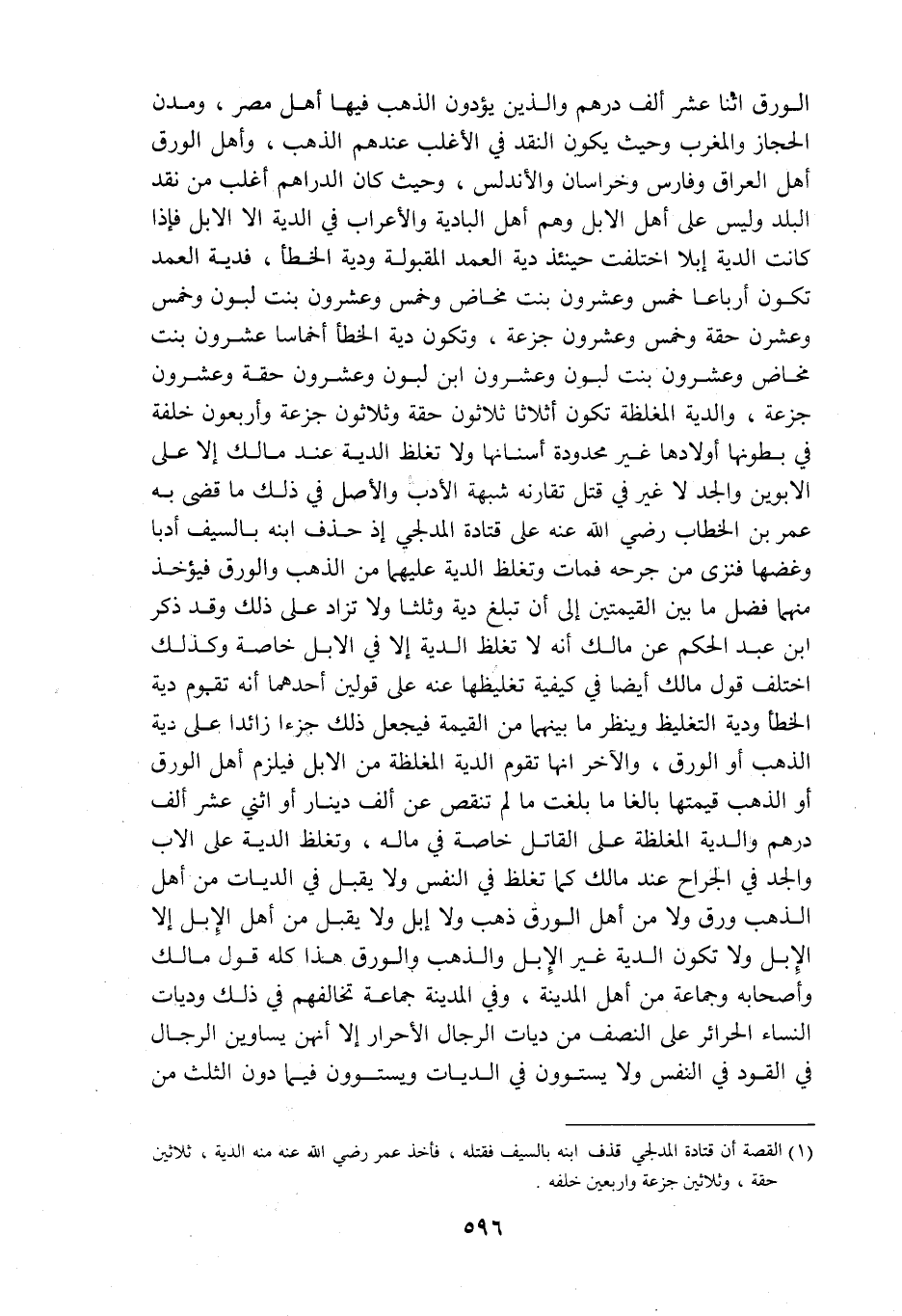 الورق اثنا عشر ألف درهم والذين يؤدون الذهب فيها أهل مصر ومدن الحجاز والمغرب وحيث يكون النقد في الأغلب عندهم الذهب وأهل الورق أهل العراق وفارس وخراسان والأندلس وحيث كان الدراهم أغلب من نقد البلد وليس على أهل الابل وهم أهل البادية والاعراب في الدية الا الابل فإذا كانت الدية إبلا اختلفت حينئذ دية العمد المقبولة ودية الخطأ فدية العمد تكون أرباعا خمس وعشرون بنت مخاض وخمس وعشرون بنت لبون وخمس وعشرون حقة وخمس وعشرون جزعة وتكون دية الخطأ أخماسا عشرون جزعة وتكون دية الخطأ أخماسا عشرون بنت مخاض وعشرون بنت لبون وعشرون ابن لبون وعشرون حقة وعشرون جزعة والدية المغلظة تكون أثلاثا ثلاثون حقة وثلاثون جزعة وأربعون خلفة في بطونها أولادها غير محدودة أسنانها ولا تغلظ الدية عند مالك إلا على الابوين والجد لا غير في قتل تقارنه شبهة الأدب والأصل في ذلك ما قضى به عمر بن الخطاب رضي الله عنه على قتادة المدلجي إذ حذف ابنه بالسيف أدبا وغضها فنزى من جرحه فمات وتغلظ الدية عليهما من الذهب والورق فيؤخذ منهما فضل ما بين القيمتين الى أن تبلغ دية وثلثا ولا تزاد على ذلك وقد ذكر ابن عبد الحكم عن مالك انه لا تغلظ الدية إلا في الابل خاصة وكذلك اختلف قول مالك أيضا في كيفية تغليظها عنه على قولين أحدهما انه تقوم دية الخطأ ودية التغليظ وينظر ما بينهما من القيمة فيجعل ذلك جزءا زائدا على دية الذهب أو الورق والآخر انها تقوم الدية المغلظة من الابل فيلزم أهل الورق او الذهب قيمتها بالغا ما بلغت ما لم تنقص عن ألف دينار أو اثني عشر ألف درهم والدية المغلظة على القاتل خاصة في ماله وتغلظ الدية على الاب والجد في الجراح عند مالك كما تغلظ في النفس ولا يقبل في الديات من أهل الذهب ورق ولا من اهل الورق ذهب ولا إبل ولا يقبل من أهل الإبل إلا الإبل ولا تكون الدية غير الإبل والذهب الورق هذا كله قول مالك وأصحابه وجماعة من اهل المدينة وفي المدينة جماعة تخالفهم في ذلك وديات النساء الحرائر على النصف من ديات الرجال الاحرار الا أنهن يساوين الرجال في القود في النفس ولا يستوون في الديات ويستوون فيما دون الثلث من