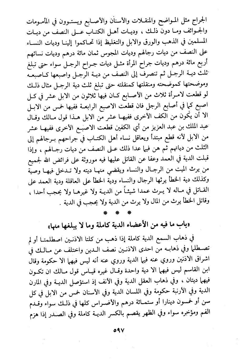 الجراح مثل المواضح والمنقلات والاسنان والاصابع ويستوون في المأمومات والجوائف وما دون ذلك وديات أهل الكتاب على النصف من ديات المسلمين في الذهب والورق والابل والتغليظ إذا تحاكموا إلينا وديات النساء على النصف من ديات رجالهم وديات المجوس ثمان مائة درهم وديات نسائهم أربع مائة درهم وديات جراح المرأة مثل ديات جراح الرجل سواء حتى تبلغ ثلث دية الرجل ثم تنصرف الى النصف من دية الرجل واصبعها كاصبعه وموضحتها كموضحته ومنقلتها كمنقلته حتى تبلغ ثلث دية الرجل مثال ذلك لو قطعت لامرأة ثلاث من الاصابع كان فيها ثلاثون من الابل عشر في كل اصبع كما في اصابع الرجل فان قطعت الاصبع الرابعة ففيها خمس من الابل الا أن يكون من الكف الاخرى ففيها عشر من الابل هذا قول مالك وقال عبدالملك بن عبدالعزيز من أي الكفين قطعت الاصبع الأخرى ففيها عشر من الابل لأنه قطع مبتدأ ويعاقل نساء أهل الكتاب في جراحهم برجالهم الى الثلث من دياتهم ثم هن فيما عدا ذلك على النصف من ديات رجالهم وإذا قبلت الدية في العمد وعفا عن القاتل عليها فيه موروثة على فرائض الله لجميع من يرث الميت من الرجال والنساء ويقضي منها ديته ولا تدخل فيها وصية وكذلك دية الخطأ يرثها الرجال والنساء ودية الخطأ على العاقلة ودية العمد على القاتل في ماله لا يرث عمدا شيئا من الدية ولا غيرها ولا يحجب أحدا وقاتل الخطأ يرث من المال ولا يرث من الدية ولا يحجب في الدية باب ما فيه من الاعضاء الدية كاملة وما لا يبلغها منها في ذهاب السمع الدية كاملة إذا ذهب من كلتا الاذنين اصطلمتا أو لم تصطلما وفي ذهابه من احدى الاذنين نصف الدية واختلف عن مالك في اشراق الاذنين وروي عنه فيما الدية وروي عنه انه ليس فيهما الا حكومة وقال ابن القاسم ليس فيهما الا دية واحدة وقال غيره قياس قول مالك ان تكون فيهما ديتان وفي ذهاب العقل الدية وفي الانف إذ استؤصل الدية وفي المارن الدية وفي الارنبة حكومة وفي اللسان الدية وفي الأسنان خمس من الابل في كل سن أو خمسون دينارا أو ستمائة درهم والأضراس كلها في ذلك سواء وقدم الفم ومؤخره سواء وفي الظهر يقصم بالكسر الدية كاملة وفي الصدر إذا هزم