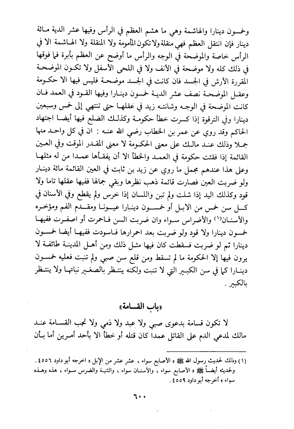 وخمسون دينارا والهاشمة وهي ما هشم العظم في الرأس وفيها عشر الدية مائة دينار فإن انتقل العظم فهي منقلة ولا تكون المأمومة ولا المنقلة ولا الهاشمة الا في الرأس خاصة والموضحة في الوجه والرأس ما أوضح عن العظم بإبرة فما فوقها في ذلك كله ولا موضحة في الأنف ولا في اللحى الاسفل ولا تكون الموضحة المقررة الأرش في الجسد فان كانت في الجسد موضحة فليس فيها الا حكومة وعقل الموضحة نصف عشر الدية خمسون ديناراوفيها القود في العمد فإن كانت الموضحة في الوجه وشانته زيد في عقلها حتى تنتهي الى خمس وسبعين دينارا وفي الترقوة إذا كسرت خطأ حكومة وكذلك الضلع فيها أيضا اجتهاد الحاكم وقد روي عن عمر بن الخطاب رضي الله عنه إن في كل واحد منها جملا وذلك عند مالك على معنى الحكومة لا معنى المقدر الموقت وفي العين القائمة إذا فقئت حكومة في العمد والخطأ الا أن يفقأها عمدا من له مثلها وعلى هذا عندهم مجمل ما روي عن زيد بن ثابت في العين القائمة مائة دينار ولو ضربت العين فصارت قائمة ذهب نظرها وبقي جمالها ففيها عقلها تاما ولا قود وكذلك اليد إذا شلت ولم تبن واللسان إذا خرس ولم يقطع وفي الأسنان في كل سن خمس من الابل أو خمسون دينارا عيونا ومقدم الفم ومؤخره والأسنان والأضراس سواء وإن ضربت السن فاحمرت أو اصفرت ففيها خمسون دينارا ولا قود ولو ضربت بعد احمرارها فاسودت ففيها أيضا خمسون دينارا ثم لو ضربت فسقطت كان فيها مثل ذلك ومن أهل المدينة طائفة لا يرون فيها إلا الحكومة ما لم تسقط ومن قلع سن صبي ولم تنبت فعليه خمسون دينارا كما في سن الكبير التي لا تنبت ولكنه ينتظر بالصغير نباتها ولا ينتظر بالكبير باب القسامة لا تكون قسامة بدعوى صبي ولا عبد ولا ذمي ولا تجب القسامة عند مالك لمدعي الدم على القاتل عمدا كان قتله أو خطأ الا بأحد أمرين أما بأن