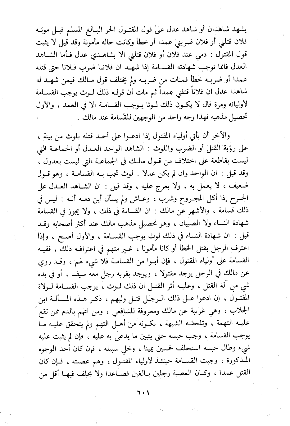 يشهد شاهدان أو شاهد عدل على قول المقتول الحر البالغ المسلم قبل موته فلان قتلني أو فلان ضربني عمدا أو خطأ وكانت حاله مأمونة وقد قيل لا يثبت قول المقتول دمي عند فلان أو فلان قتلني الا بشاهدي عدل فأما الشاهد العدل فإنما توجب شهادته القسامة إذا شهد ان فلانا ضرب فلانا حتى قتله عمدا أو ضربه خطأ فمات من ضربه ولم يختلف قول مالك فيمن شهد له شاهدا عدل ان فلانا قتلني عمدا ثم مات ان قوله ذلك لوث يوجب القسامة لأوليائه ومرة قال لا يكون ذلك لوثا يوجب القسامة الا في العمد والأول تحصيل مذهبه فهذا وجه واحد من الوجهين للقسامة عند مالك والآخر أن يأتي أولياء المقتول إذا ادعوا على أحد قتله بلوث من بينة على رؤية القتل أو الضرب واللوث الشاهد الواحد العدل أو الجماعة التي ليست بقاطعة على اختلاف من قول مالك في الجماعة التي ليست بعدول وقد قيل ان الواحد وإن لم يكن عدلا لوث تجب به القسامة وهو قول ضعيف لا يعمل به ولا يعرج عليه وقد قيل ان الشاهد العدل على الجرح إذا أكل المجروح وشرب وعاش ولم يسأل أين دمه أنه ليس في ذلك قسامة والأشهر عن مالك ان القسامة في ذلك ولا يجوز في القسامة شهادة النساء ولا الصبيان وهو تحصيل مذهب مالك عند أكثر أصحابه وقد قيل ان شهادة النساء في ذلك لوث يوجب القسامة والأول أصح وإذا اعترف الرجل بقتل الخطأ أو كانا مأمونا غير متهم في اعترافه ذلك ففيه القسامة على أولياء المقتول فإن أبوا من القسامة فلا شيء لهم وقد روي عن مالك في الرجل يوجد مقتولا ويوجد بقربه رجل معه سيف أو في يده شي من آلة القتل وعليه أثر القتل أن ذلك لوث يوجب القسامة لولاة المقتول ان ادعوا على ذلك الرجل قتل وليهم ذكر هذه المسألة ابن الجلاب وهي غريبة عن مالك ومعروفة للشافعي ومن اتهم بالدم ممن تقع عليه التهمة وتلحقه الشبهة بكونه من أهل التهم ولم يتحقق عليه ما يوجب القسامة وجب حبسه حتى يتبين ما يدعى به عليه فإن لم يثبت عليه شيء وطال حبسه استحلف خمسين يمينا وخلي سبيله فإن كان أحد الوجوه المذكورة وجبت القسامة حينئذ لأولياء المقتول وهم عصبته فإن كان القتل عمدا وكان العصبة رجلين بالغين فصاعدا ولا يحلف فيه أقل من
