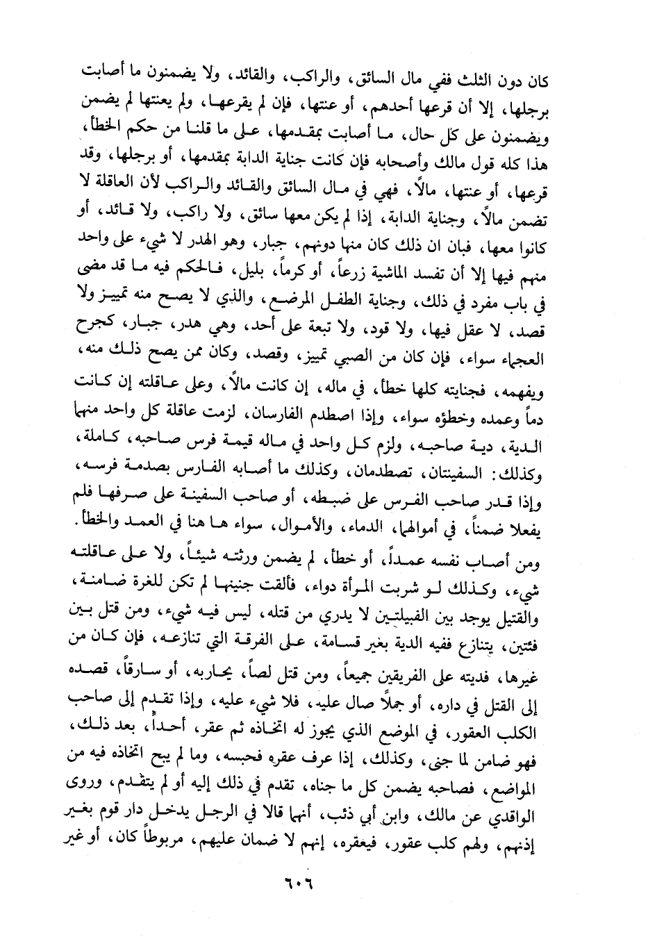 كان دون الثلث ففي مال السائق والراكب والقائد ولا يضمنون ما أصابت برجلها إلا أن قرعها أحدهم أو عنتها فإن لم يقرعها ولم يعنتها لم يضمن ويضمنون على كل حال ما أصابت بمقدمها على ما قلنا من حكم الخطأ هذا كله قول مالك وأصحابه فإن كانت جناية الدابة بمقدمها أو برجلها وقد قرعها أو عنتها مالا فهي في مال السائق والقائد والراكب لأن العاقلة لا تضمن مالا فهي في مال السائق والقائد والراكب لأن العاقلة لا تضمن مالا وجناية الدابة إذا لم يكن معها سائق ولا راكب ولا قائد أو كانوا معها فبان أن ذلك كان منها دونهم جبار وهو الهدر لا شيء على واحد منهم فيهم إلا أن تفسد الماشية زرعا أو كرما بليل فالحكم فيه ما قد مضى في باب مفرد في ذلك وجناية الطفل المرضع والذي لا يصح منه تمييز ولا قصد لا عقل فيها ولا قود ولا تبعة على أحد وهي هدر جبار كجرح العجماء سواء فإن كان من الصبي تمييز وقصد وكان ممن يصح ذلك منه ويفهمه فجنايته كلها خطأ في ماله إن كانت مالا وعلى عاقلته إن كانت دما وعمده وخطؤه سواء وإذا اصطدم الفارسان لزمت عاقلة كل واحد منهما الدية دية صاحبه ولزم كل واحد في ماله قيمة فرس صاحبه كاملة وكذلك السفينتان تصطدمان وكذلك ما أصابه الفارس بصدمة فرسه وإذا قدر صاحب الفرس على ضبطه أو صاحب السفينة على صرفها فلم يفعلا ضمنا في أموالهما الدماء والأموال سواء ها هنا في العمد والخطأ ومن أصاب نفسه عمدا أو خطأ لم يضمن ورثته شيئا ولا على عاقلته شيء وكذلك لو شربت المرأة دواء فالقت جنينها لم تكن للغرة ضامنة والقتيل يوجد بين القبيلتين لا يدري من قتله ليس فيه شيء ومن قتل بين فئتين يتنازع ففيه الدية بغير قسامة على الفرقة التي تنازعه فإن كان من غيرها فديته على الفريقين جميعا ومن قتل لصا يحاربه أو سارقا قصده الى القتل في داره أو جملا صال عليه فلا شيء عليه وإذا تقدم الى صاحب الكلب العقور في الموضع الذي يجوز له اتخاذه ثم عقر أحدا بعد ذلك فهو ضامن لما جنى وكذلك إذا عرف عقره فحبسه وما لم يبح اتخاذه فيه من المواضع فصاحبه يضمن كل ما جناه تقدم في ذلك إليه أو لم يتقدم وروى الواقدي عن مالك وابن ابي ذئب أنهما قالا في الرجل يدخل دار قوم بغير إذنهم ولهم كلب عقور فيعقره إنهم لا ضمان عليهم مربوطا كان أو غيره