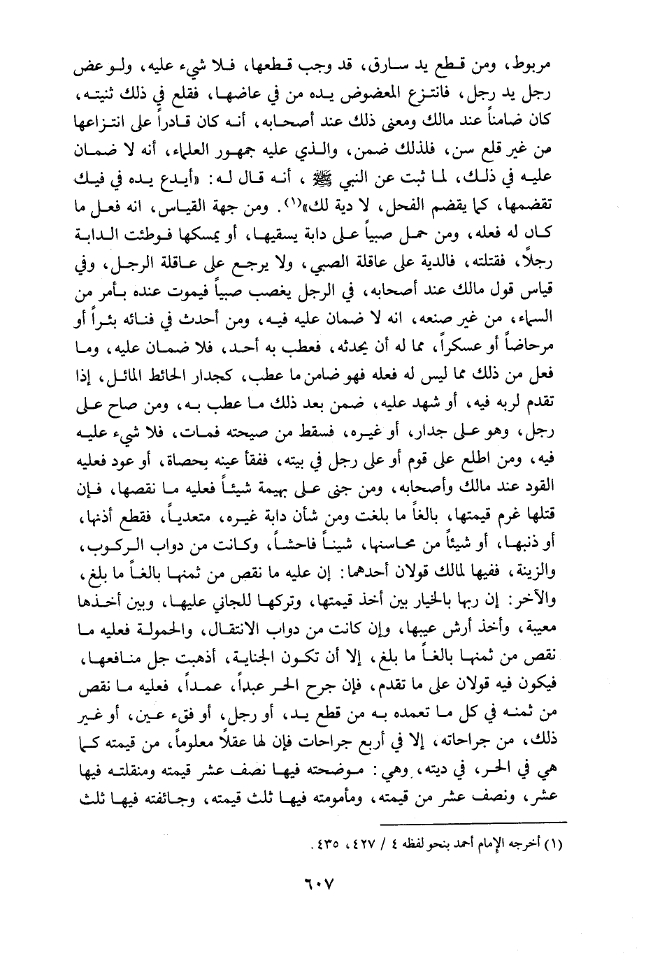 مربوط ومن قطع يد سارق قد وجب قطعها فلا شيء عليه ولو عض رجل يد رجل فانتزع المعضوض يده من في عاضها فقلع في ذلك ثنيته كان ضامنا عند مالك ومعنى ذلك عند أصحابه أنه كان قادرا على انتزاعها من غير قلع سن فلذلك ضمن والذي عليه جمهور العلماء انه لا ضمان عليه في ذلك لما ثبت عن النبي صلى الله عليه وسلم أنه قال له أيدع يده في فيك تقضمها كما يقضم الفحل لا دية لك ومن جهة القياس أنه فعل ما كان له فعله ومن حمل صبيا على دابة يسقيها أو يمسكها فوطئت الدابة رجلا فقتلته فالدية على عاقلة الصبي ولا يرجع على عاقلة الرجل وفي قياس قول مالك عند أصحابه في الرجل يغصب صبيا فيموت عنده بأمر من السماء من غير صنعه انه لا ضمان عليه فيه ومن أحدث في فنائه بئرا أو مرحاضا أو عسكرا مما له أن يحدثه فعطب به أحد فلا ضمان عليه وما فعل من ذلك مما ليس له فعله فهو ضامن ما عطب كجدار الحائط المائل إذا تقدم لربه فيه أو شهد عليه ضمن بعد ذلك ما عطب به ومن صاح على رجل وهو على جدار أو غيره فسقط من صيحته فمات فلا شيء عليه فيه ومن اطلع على قوم أو على رجل في بيته ففقأ عينه بحصاة أو عود فعليه القود عند مالك وأصحابه ومن جنى على بهيمة شيئا فعليه ما نقصها فإن قتلها غرم قيمتها بالغا ما بلغت ومن شأن دابة غيره متعديا فقطع أذنها أو ذنبها أو شيئا من محاسنها شيئا فاحشا وكانت من دواب الركوب والزينة ففيها لمالك قولان أحدهما إن عليه ما نقص من ثمنها بالغا ما بلغ والآخر إن ربها بالخيار بين أخذ قيمتها وتركها للجاني عليها وبين أخذها معيبة وأخذ أرش عيبها وإن كانت من دواب الانتقال والحمولة فعليه ما نقص من ثمنها بالغا ما بلغ إلا أن تكون الجناية أذهبت جل منافعها فيكون فيه قولان على ما تقدم فإن جرح الحر عبدا عمدا فعليه ما نقص من ثمنه في كل ما تعمده به من قطع يد أو رجل أوفقء عين أو غير ذلك من جراحاته إلا في أربع جراحات فإن لها عقلا معلوما ومن قيمته كما هي في الحر في ديته وهي موضحته فيها نصف عشر قيمته ومنقلته فيها عشر ونصف عشر من قيمته ومأمومته فيها ثلث قيمته ومأمومته فيها ثلث قيمته وجائفته فيها ثلث