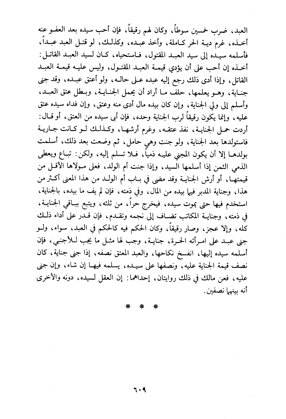العبد ضرب خمسين سوطا وكان لهم رقيقا فإن أحب سيده بعد العفو عنه أخذه غرم دية الحر كاملة وأخذ عبده وكذلك لو قتل العبد عبدا فأسلمه سيده الى سيد العبد المقتول فاستحياه كان لسيد العبد القاتل أخذه إن أحب على أن يؤدي قيمة العبد المقتول وليس عليه قيمة العبد القاتل وإذا أدى ذلك رجع إليه عبده على حاله ولو أعتق عبده وقد جنى جناية وهو يعلمها حلف ما أراد أن يحمل الجناية وبطل عتق العبد وأسلم إلى ولي الجناية وإن كان بيده مال أدى منه وعتق وإن فداه سيده عتق عليه وإنما يكون رقيقا لرب الجناية وحده فإن أبى سيده من العتق أو قال أردت حمل الجناية نفذ عتقه وغرم أرشها وكذلك لو كانت جارية فاستولدها بعد الجناية ولو جنت وهي حامل ثم وضعت بعد ذلك أسلمت بولدها إلا ان يكون المجني عليه ذميا فلا تسلم إليه ولكن تباع ويعطى الذمي الثمن إذا أسلمها السيد وإذا جنت ام الولد فعلى مولاها الأقل من قيمتها أو أرش الجناية وقد مضى في باب أم الولد من هذا المعنى أكثر من هذا وجناية المدبر فيما بيده من المال وفي ذمته فإن لم يف ما بيده بالجناية استخدم فيها حتى يموت سيده فيخرج حرا من ثلثه ويتبع بباقي الجناية في ذمته وجناية المكاتب تضاف الى نجمه وتقدم فإن قدر على أداء ذلك كله وإلا عجز وصار رقيقا وكان الحكم فيه كالحكم في العبد سواء ولو جنى عبد على امرأته الحرة جناية وجب لها مثل ما يجب للأجنبي فإن أسلمه سيده إليها انفسخ نكاحها والعبد المعتق نصفه إذا جنى جناية كان نصف قيمة الجناية عليه ونصفها على سيده يسلمه فيها إن شاء وإن جنى عليه فعن مالك في ذلك روايتان إحداهما إن العقل لسيده دونه والأخرى أنه بينهما نصفين
