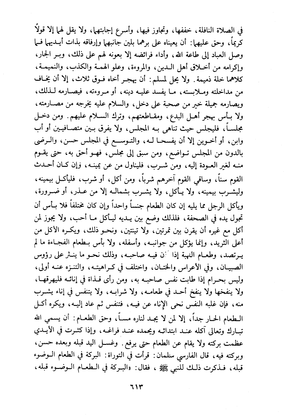 في الصلاة النافلة خففها وتجاوز فيها ولأ يقل لهما ألأ قولأ كريما وحق عليهما ان يعينهما على برهما بلين جانبهما وارفاقه بذات ايديهما فما وصل العباد الى طاعة الله واداء فرائضه الأ بعونه لهم على ذلك وبر الجار واكرامه من اخلأق اهل الدين والمروءة وعمو الهمة والكذب والنميمة كلأهما خلة ذميمة ولا يحل لمسلم ان يهجر اخاه فوق ثلاث الا ان يخاف من مداخلته وملابسته ما يفسد عليه دينه أو مروءته فيصارمه لذلك ويصارمه جميلة خير من صحبة على دخل والسلام عليه يخرجه من مصارمته ولا بأس بهجر أهل البدع ومقاطعتهم وترك السلام عليهم ومن دخل مجلسا فليجلس حيث تناهى به المجلس ولا يفرق بين متصافيين أو أب وابن أو أخوين إلا أن يفسحا له والتوسع في المجلس حسن والرضى بالدون من المجلس تواضع ومن سبق الى مجلس فهو أحق به حتى يقوم منه لغير العودة إليه ومن شرب فليناول من عن يمينه وأن كان أحدث القوم سنا وساقي القوم آخرهم شربا ومن أكل أو شرب فليأكل بيمينه وليشرب بيمينه ولا يأكل ولا يشرب بشماله إلا من عذر أو ضرورة ويأكل الرجل مما يليه إن كان الطعام جنسا واحدا وإن كان مختلفا فلا بأس أن تجول يده في الصفحة فلذلك وضع بين يديه ليأكل ما أحب ولا يجوز لمن أكل مع غيره أن يقرن بين تمرتين ولا تينتين ونحو ذلك ويكره الأكل من أعلى الثريد وإنما يؤكل من جوانبه وأسفله ولا بأس بطعام الفجاءة ما لم يرتصد وطعام النهبة إذا أذن فيه صاحبه وذلك نحو ما ينثر على رؤوس الصبيان وفي الأعراس والختان واختلف في كراهيته والتنزه عنه أولى وليس بحرام إذا طابت نفس صاحبه به ومن رأى قذاة في إنائه فليهرقها ولا ينفخها ولا ينفخ أحد في طعامه ولا شرابه ولا يتنفس في إناء يشرب منه فإن غلبه النفس نحى الإناء عن فيه فتنفس ثم عاد إليه ويكره أكل الطعام الحار جدا الا لمن لا يجد لناره مسا وحق الطعام أن يسمي الله تبارك وتعالى آكله عند ابتدائه ويحمده عند فراغه وإذا كثرت في الأيدي عظمت بركته ولا يقام عن الطعام حتى يرفع وغسل اليد قبله وبعده حسن وبركته فيه قال الفارسي سلمان قرأت في التوارة البركة في الطعام الوضوء قبله فذكرت ذلك النبي صلى الله عليه وسلم فقال البركة في الطعام الوضوء قبله