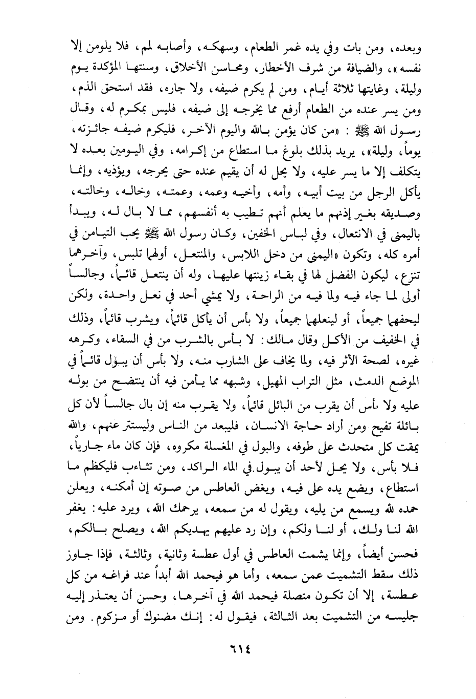 وبعده ومن بات وفي يده غمر الطعام وسهكه وأصابه لمم فلا يلومن إلا نفسه والضيافة من شرف الأخطار ومحاسن الاخلاق وسنتها المؤكدة يوم وليلة وغايتها ثلاثة أيام ومن لم يكرم ضيفه ولا جاره فقد استحق الذم ومن يسر عنده من الطعام ارفع مم يخرجه الى ضيفه فليس بمكرم له وقال رسول الله صلى الله عليه وسلم من كان يؤمن بالله واليوم الآخر فليكرم ضيفه جائزته يوما وليلة يريد بذلك بلوغ ما استطاع من إكرامه وفي اليومين بعده لا يتكلف الا ما يسر عليه ولا يحل له أن يقيم عنده حتى يحرجه ويؤذيه وإنما يأكل الرجل من بيت أبيه وأمه وأخيه وعمه وعمته وخاله وخالته وصديقه بغير إذنهم ما يعلم أنهم تطيب به أنفسهم مما لا بال له وخالته وصديقه بغير إذنهم ما يعلم أنهم تطيب به أنفسهم مما لا بال له ويبدأ باليمنى في الانتعال وفي لباس الخفين وكان رسول الله صلى الله عليه وسلم يحب التيامن في أمره كله وتكون اليمنى من دخل اللابس والمنتعل أولهما تلبس وآخرهما تنزع ليكون الفضل لها في بقاء زينتها عليها وله أن ينتعل قائما وذلك في الخفيف جميعا أو لينعلهما جميعا ولا بأس أن يأكل قائما ويشرب قائما وذلك في الخفيف من الأكل وقال مالك لا بأس بالشرب من في السقاء وكرهه غيره لصحة الأثر فيه ولما يخاف على الشارب منه ولا بأس أن يبول قائما في الموضع الدمث مثل التراب المهيل وشبهه مما يأمن فيه أن ينتضح من بوله عليه ولا بأس أن يقرب من البائل قائما ولا يقرب منه إن بال جالسا لأن كل بائلة تفيح ومن أراد حاجة الانسان فليبعد من الناس ولستتر عنهم والله يمقت كل متحدث على طوفه والبول في المغسلة مكروه فإن كان ماء جاريا فلا بأس ولا يحل لأحد أن يبول في الماء الراكد ومن تثاءب فليكظم ما استطاع ويضع يده على فيه ويغض العاطس من صوته إن أمكنه ويعلن حمده لله ويسمع من يليه ويقول له من سمعه يرحمك الله ويرد عليه يغفر الله لنا ولك أو لنا ولكم وإن رد عليهم يهديكم الله ويصلح بالكم فحسن أيضا وإنما يشمت العاطس في أول عطسة وثانية وثالثة فإذا جاوز ذلك سقط التشميت عمن سمعه وأما هو فيحمد الله أبدا عند فراغه من كل عطسة إلا أن تكون متصلة فيحمد الله أبدا عند فراغه من كل عطسة إلا ان تكون متصلة فيحمد في آخرها وحسن أن يعتذر إليه جليسه من التشميت بعد الثالثة فيقول له إنك مضنوك أو مزكوم ومن