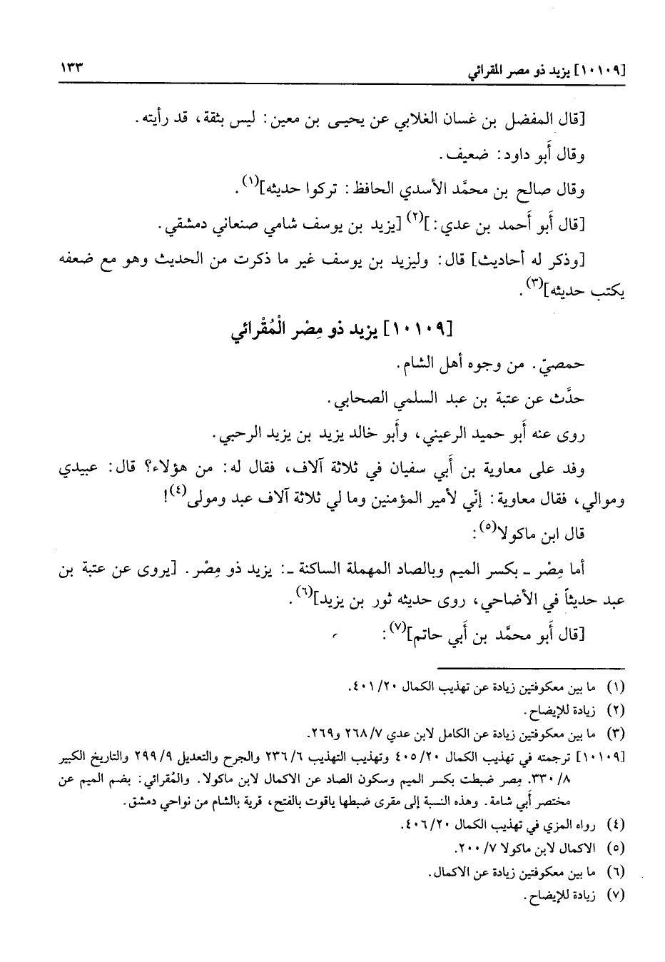 [10109] ترجمته في تهذيب الكمال 20/405 وتهذيب التهذيب 6/236 والجرح والتعديل 9/299 والتاريخ الكبير 8/330. مصر ضبطت بكسر الميم وسكون الصاد عن الاكمال لابن ماكولا. والمقرائي: بضم الميم عن مختصر أبي شامة. وهذه النسبة إلى مقرى ضبطها ياقوت بالفتح، قرية بالشام من نواحي دمشق.