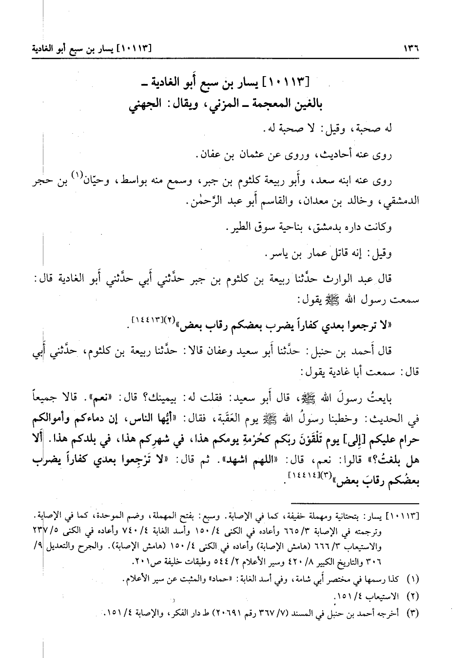 وترجمته في الإصابة 3/665 وأعاده في الكنى 4/150 وأسد الغابة 4/740 وأعاده في الكنى 5/237 والاستيعاب 3/666 (هامش الإصابة) وأعاده في الكنى 4/150 (هامش الإصابة) . والجرح والتعديل 9/306 والتاريخ الكبير 8/420 وسير الأعلام 2/544 وطبقات خليفة ص 201.