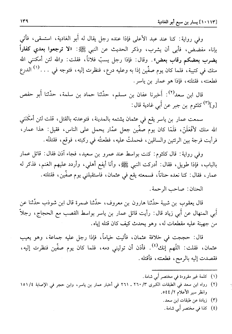 وفي رواية: قال كلثوم: كنت بواسط عند عمرو بن سعيد، فجاء آذن فقال: قاتل عمار بالباب، فإذا طويل، فقال: أدركت النبي صلّى الله عليه وسلّم، وأنا أيفع أهلي، وأردد عليهم الغنم، فذكر له عمار، فقال: كنا نعده حنانا، فسمعته يقع في عثمان، فاستقبلني يوم صفّين، فقتلته.