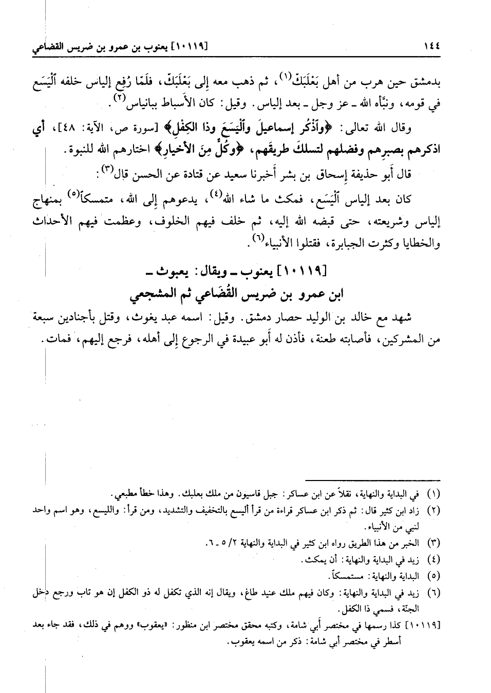 كان بعد إلياس اليسع، فمكث ما شاء الله «4» ، يدعوهم إلى الله، متمسكا «5» بمنهاج إلياس وشريعته، حتى قبضه الله إليه، ثم خلف فيهم الخلوف، وعظمت فيهمالأحداث والخطايا وكثرت الجبابرة، فقتلوا الأنبياء «6» .