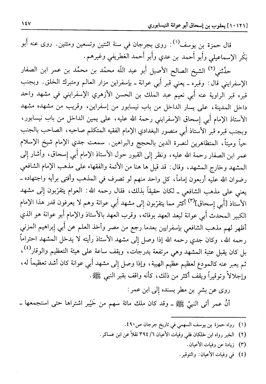 حدّثني «2» الشيخ الصالح الأصيل أبو عبد الله محمّد بن محمّد بن عمر ابن الصفار الإسفرايني قال: وقبره- يعني قبر أبي عوانة- بإسفراين مزار العالم ومتبركالخلق. وبجنب قبره قبر الراوية عنه أبي نعيم عبد الملك بن الحسن الأزهري الإسفرايني في مشهد واحد داخل المدينة، على يسار الداخل من باب نيسابور من إسفراين، وقريب من مشهده مشهد الأستاذ الإمام أبي إسحاق الإسفرايني رحمة الله عليه، على يمين الداخل من باب نيسابور، وبجنب قبره قبر الأستاذ أبي منصور البغدادي الإمام الفقيه المتكلم صاحبه، الصاحب بالجنب حيا وميتا، المتظاهرين لنصرة الدين بالحجج والبراهين. سمعت جدي الإمام شيخ الإسلام عمر ابن الصفار رحمة الله عليه، ونظر إلى القبور حول الأستاذ الإمام أبي إسحاق، وأشار إلى المشهد وخارج المشهد، وقال: قد قيل ها هنا من الأئمة والفقهاء على مذهب الإمام الشافعي رضوان الله عليه أربعون إماما، كل واحد منهم لو تصرف في المذهب وأفتى برأيه واجتهاده- يعني على مذهب الشافعي- لكان حقيقا بذلك، فقال رحمه الله: العوام يتقرّبون إلى مشهد الأستاذ [أبي إسحاق] «3» أكثر مما يتقرّبون إلى مشهد أبي عوانة وهم لا يعرفون قدر هذا الإمام الكبير المحدث أبي عوانة لبعد العهد بوفاته، وقرب العهد بالأستاذ والإمام أبو عوانة هو الذي أظهر لهم مذهب الشافعي بإسفرايين بعد ما رجع من مصر وأخذ العلم عن أبي إبراهيم المزني رحمه الله، وكان جدي رحمه الله إذا وصل إلى مشهد الأستاذ رأيته لا يدخل المشهد احتراما بل كان يقبل عتبة المشهد وهي مرتفعة بدرجات، ويقف ساعة على هيئة التعظيم والوقار «4» ، ثم يعبر عنه كالمودع لعظيم عظيم الهيبة، وإذا وصل إلى مشهد أبي عوانة كان أشد تعظيما له، وإجلالا وتوقيرا ويقف أكثر من ذلك، كأنه واقف بقبر النبي صلّى الله عليه وسلّم.