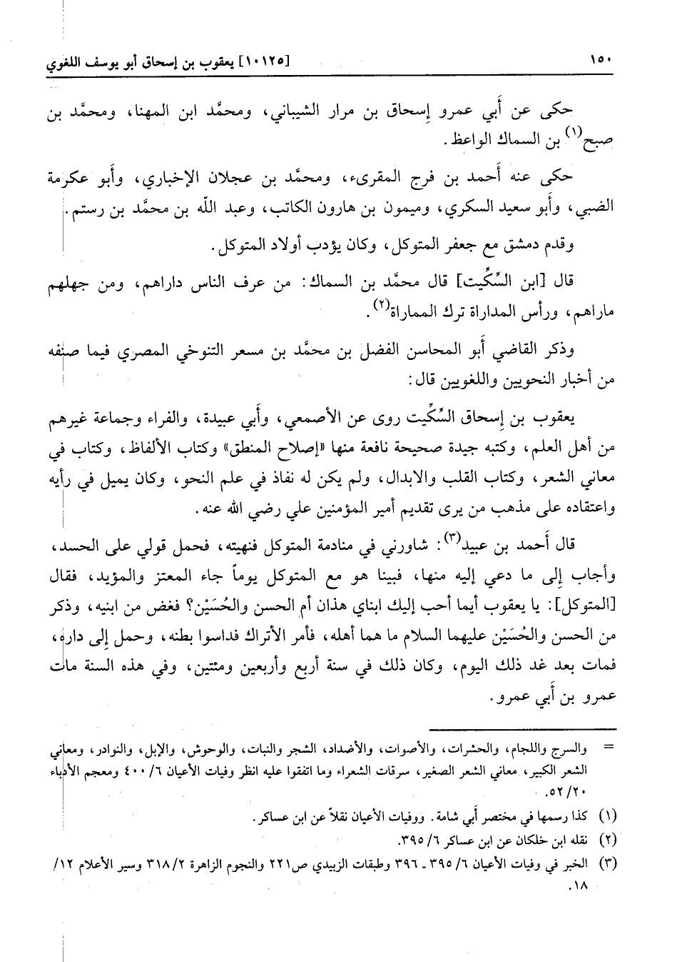 يعقوب بن إسحاق السّكّيت روى عن الأصمعي، وأبي عبيدة، والفراء وجماعة غيرهم من أهل العلم، وكتبه جيدة صحيحة نافعة منها «إصلاح المنطق» وكتاب الألفاظ، وكتاب في معاني الشعر، وكتاب القلب والابدال، ولم يكن له نفاذ في علم النحو، وكان يميل في رأيه واعتقاده على مذهب من يرى تقديم أمير المؤمنين علي رضي الله عنه. قال أحمد بن عبيد «3» : شاورني في منادمة المتوكل فنهيته، فحمل قولي على الحسد، وأجاب إلى ما دعي إليه منها، فبينا هو مع المتوكل يوما جاء المعتز والمؤيد، فقال [المتوكل] : يا يعقوب أيما أحب إليك ابناي هذان أم الحسن والحسين؟ فغض من ابنيه، وذكر من الحسن والحسين عليهما السلام ما هما أهله، فأمر الأتراك فداسوا بطنه، وحمل إلى داره، فمات بعد غد ذلك اليوم، وكان ذلك في سنة أربع وأربعين ومئتين، وفي هذه السنة مات عمرو بن أبي عمرو.