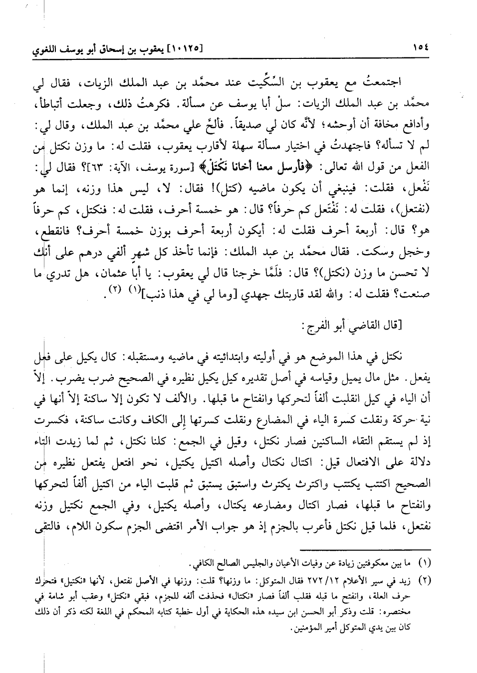 [سورة يوسف، الآية: 63] ؟ فقال لي: نفعل، فقلت: فينبغي أن يكون ماضيه (كتل) ! فقال: لا، ليس هذا وزنه، إنما هو (نفتعل) ، فقلت له: نفتعل كم حرفا؟ قال: هو خمسة أحرف، فقلت له: فنكتل، كم حرفا هو؟ قال: أربعة أحرف فقلت له: أيكون أربعة أحرف بوزن خمسة أحرف؟ فانقطع، وخجل وسكت. فقال محمّد بن عبد الملك: فإنما تأخذ كل شهر ألفي درهم على أنك لا تحسن ما وزن (نكتل) ؟ قال: فلمّا خرجنا قال لي يعقوب: يا أبا عثمان، هل تدري ما صنعت؟ فقلت له: والله لقد قاربتك جهدي [وما لي في هذا ذنب] «1» «2» .