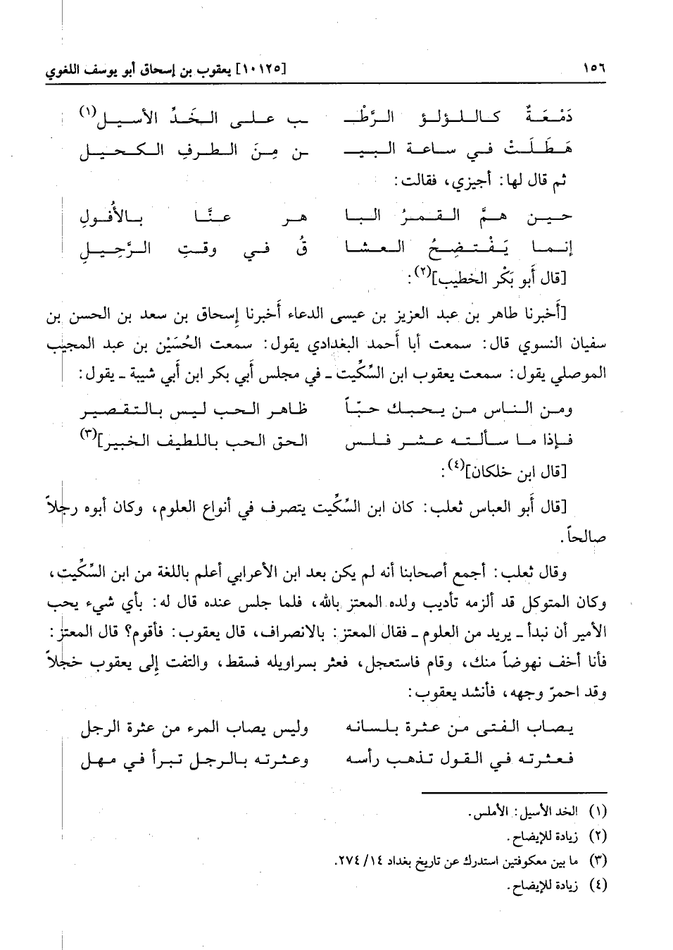 [أخبرنا طاهر بن عبد العزيز بن عيسى الدعاء أخبرنا إسحاق بن سعد بن الحسن بن سفيان النسوي قال: سمعت أبا أحمد البغدادي يقول: سمعت الحسين بن عبد المجيب الموصلي يقول: سمعت يعقوب ابن السّكّيت- في مجلس أبي بكر ابن أبي شيبة- يقول: