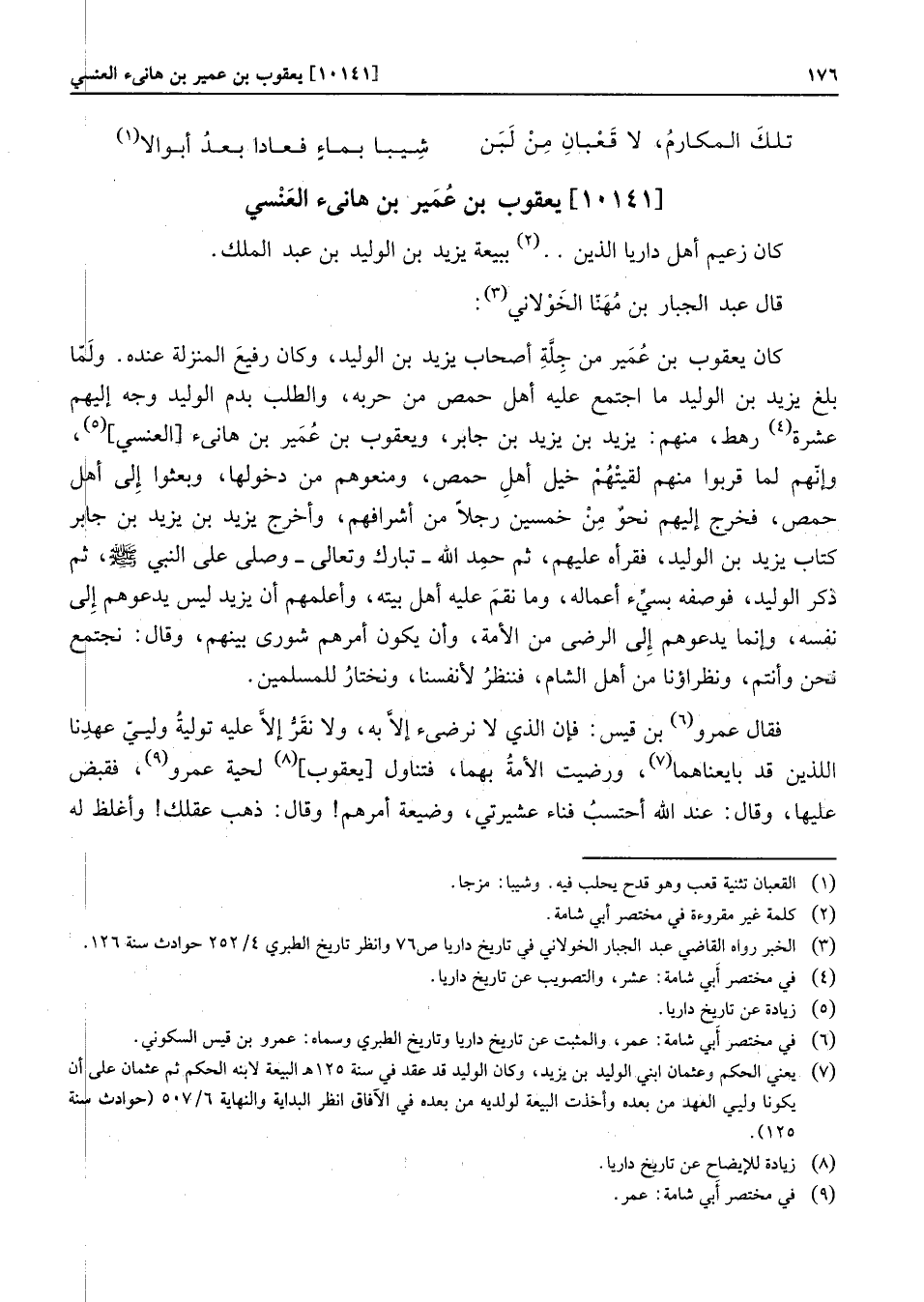 كان يعقوب بن عمير من جلّة أصحاب يزيد بن الوليد، وكان رفيع المنزلة عنده. ولمّا بلغ يزيد بن الوليد ما اجتمع عليه أهل حمص من حربه، والطلب بدم الوليد وجه إليهم عشرة «4» رهط، منهم: يزيد بن يزيد بن جابر، ويعقوب بن عمير بن هانىء [العنسي] «5» ، وإنّهم لما قربوا منهم لقيتهم خيل أهل حمص، ومنعوهم من دخولها، وبعثوا إلى أهل حمص، فخرج إليهم نحو من خمسين رجلا من أشرافهم، وأخرج يزيد بن يزيد بن جابر كتاب يزيد بن الوليد، فقرأه عليهم، ثم حمد الله- تبارك وتعالى- وصلى على النبي صلى الله عليه وسلّم، ثم ذكر الوليد، فوصفه بسيّء أعماله، وما نقم عليه أهل بيته، وأعلمهم أن يزيد ليس يدعوهم إلى نفسه، وإنما يدعوهم إلى الرضى من الأمة، وأن يكون أمرهم شورى بينهم، وقال: نجتمع نحن وأنتم، ونظراؤنا من أهل الشام، فننظر لأنفسنا، ونختار للمسلمين.