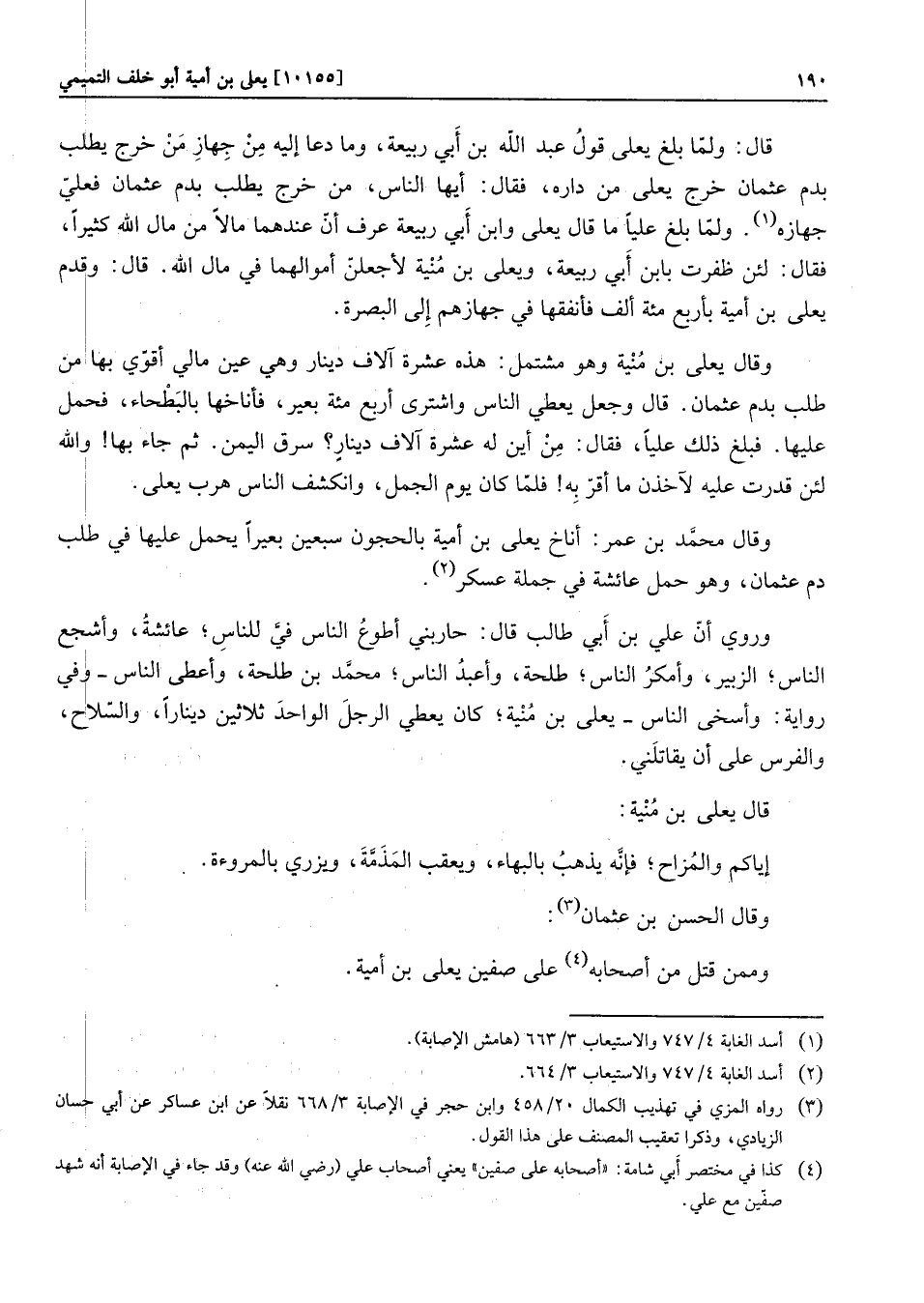 وقال محمّد بن عمر: أناخ يعلى بن أمية بالحجون سبعين بعيرا يحمل عليها في طلب دم عثمان، وهو حمل عائشة في جملة عسكر «2» . وروي أنّ علي بن أبي طالب قال: حاربني أطوع الناس فيّ للناس، عائشة، وأشجع الناس، الزبير، وأمكر الناس، طلحة، وأعبد الناس، محمّد بن طلحة، وأعطى الناس- وفي رواية: وأسخى الناس- يعلى بن منية، كان يعطي الرجل الواحد ثلاثين دينارا، والسّلاح، والفرس على أن يقاتلني.