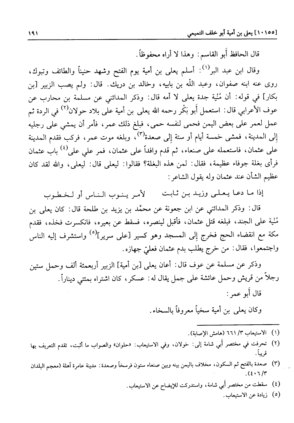 وقال ابن عبد البر «1» : أسلم يعلى بن أمية يوم الفتح وشهد حنينا والطائف وتبوك، روى عنه ابنه صفوان، وعبد الله بن بابيه، وخالد بن دريك. قال: ولم يصب الزبير [بن بكار] في قوله: أن منية جدة يعلى لا أمه قال: وذكر المدائني عن مسلمة بن محارب عن عوف الأعرابي قال: استعمل أبو بكر رحمه الله يعلى بن أمية على بلاد حولان «2» في الردة ثم عمل لعمر على بعض اليمن فحمى لنفسه حمى، فبلغ ذلك عمر، فأمر أن يمشي على رجليه إلى المدينة، فمشى خمسة أيام أو ستة إلى صعدة «3» ، وبلغه موت عمر، فركب فقدم المدينة على عثمان، فاستعمله على صنعاء، ثم قدم وافدا على عثمان، فمر علي على «4» باب عثمان فرأى بغلة جوفاء عظيمة، فقال: لمن هذه البغلة؟ فقالوا: ليعلى قال: ليعلى، والله لقد كان عظيم الشأن عند عثمان وله يقول الشاعر: