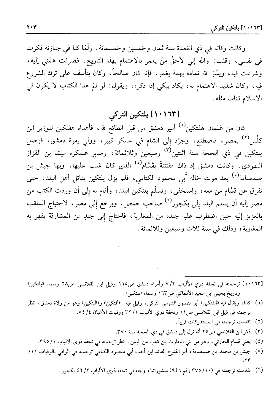 [10163] ترجمته في تحفة ذوي الألباب 2/7 وأمراء دمشق ص 115 وذيل ابن القلانسي ص 28 وسماه «بلتكين» وتاريخ يحيى بن سعيد الأنطاكي ص 163 وسماه «تلتكين» .