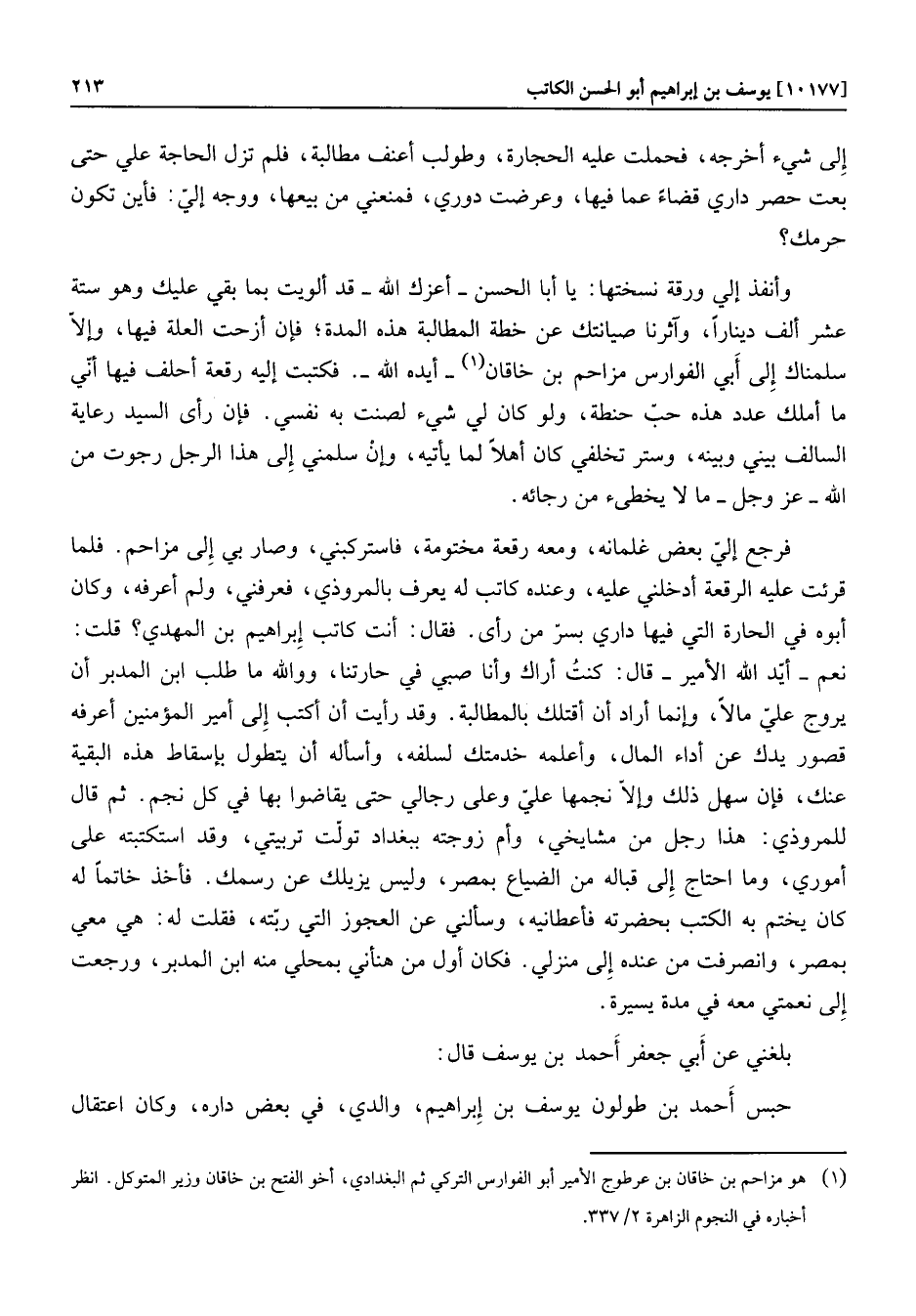فرجع إليّ بعض غلمانه، ومعه رقعة مختومة، فاستركبني، وصار بي إلى مزاحم. فلما قرئت عليه الرقعة أدخلني عليه، وعنده كاتب له يعرف بالمروذي، فعرفني، ولم أعرفه، وكان أبوه في الحارة التي فيها داري بسرّ من رأى. فقال: أنت كاتب إبراهيم بن المهدي؟ قلت: