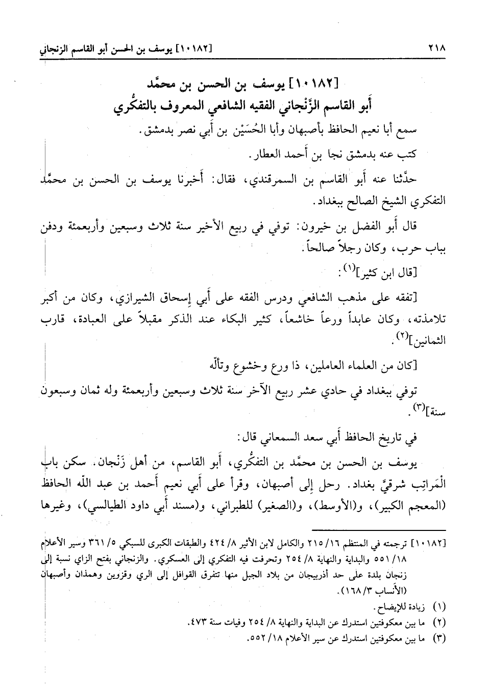 [10182] ترجمته في المنتظم 16/215 والكامل لابن الأثير 8/424 والطبقات الكبرى للسبكي 5/361 وسير الأعلام 18/551 والبداية والنهاية 8/254 وتحرفت فيه التفكري إلى العسكري. والزنجاني بفتح الزاي نسبة إلى زنجان بلدة على حد أذربيجان من بلاد الجبل منها تتفرق القوافل إلى الري وقزوين وهمذان وأصبهان (الأنساب 3/168) .