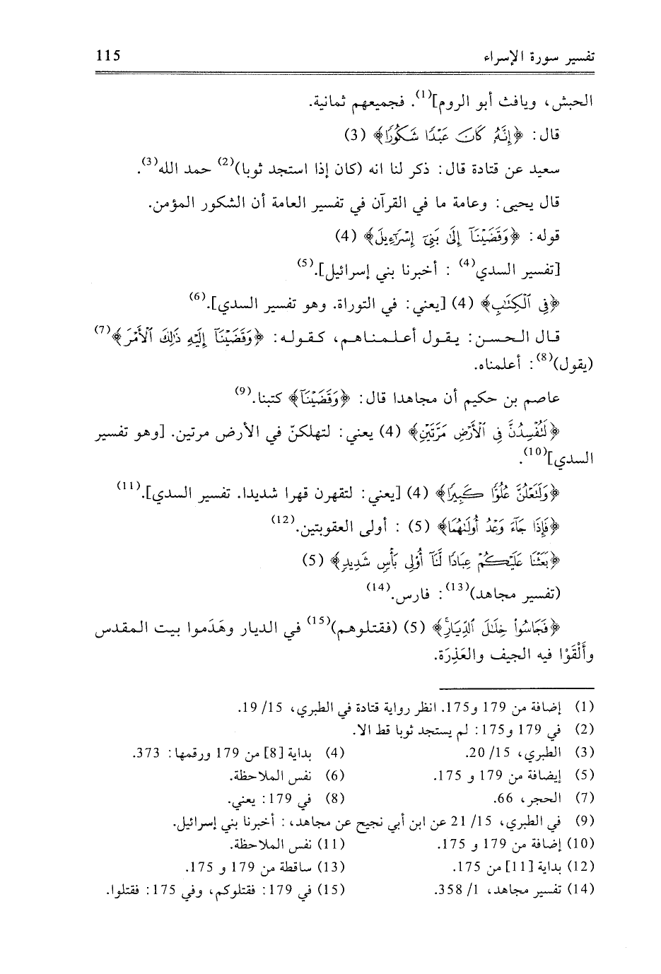 {بَعَثْنَا عَلَيْكُمْ عِبَادًا لَنَا أُولِي بَأْسٍ شَدِيدٍ} [الإسراء: 5] تَفْسِيرُ مُجَاهِدٍ: فَارِسَ.