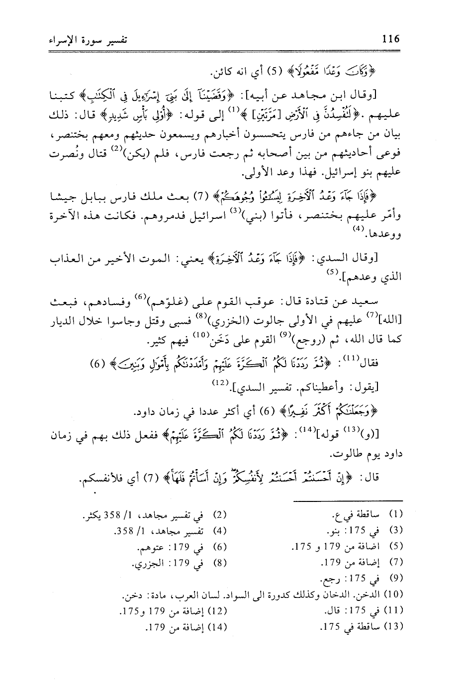 وَقَالَ ابْنُ مُجَاهِدٍ عَنْ أَبِيهِ: {وَقَضَيْنَا إِلَى بَنِي إِسْرَائِيلَ فِي الْكِتَابِ} [الإسراء: 4] كَتَبْنَا عَلَيْهِمْ {لَتُفْسِدُنَّ فِي الأَرْضِ مَرَّتَيْنِ} [الإسراء: 4] إِلَى قَوْلِهِ: {أُولِي بَأْسٍ شَدِيدٍ} [الإسراء: 5] ، قَالَ: ذَلِكَ بَيَانُ مَنْ جَاءَهُمْ مِنْ فَارِسَ، يَتَحَسَّسُونَ أَخْبَارَهُمْ، وَيَسْمَعُونَ حَدِيثَهُمْ، وَمَعَهُمْ بُخْتَنَصَّرَ، فَوَعَى أَحَادِيثَهُمْ مِنْ بَيْنِ أَصْحَابِهِ، ثُمَّ رَجَعَتْ فَارِسُ فَلَمْ يَكُنْ قِتَالٌ، وَنُصِرَتْ عَلَيْهِمْ بَنُو إِسْرَائِيلَ.