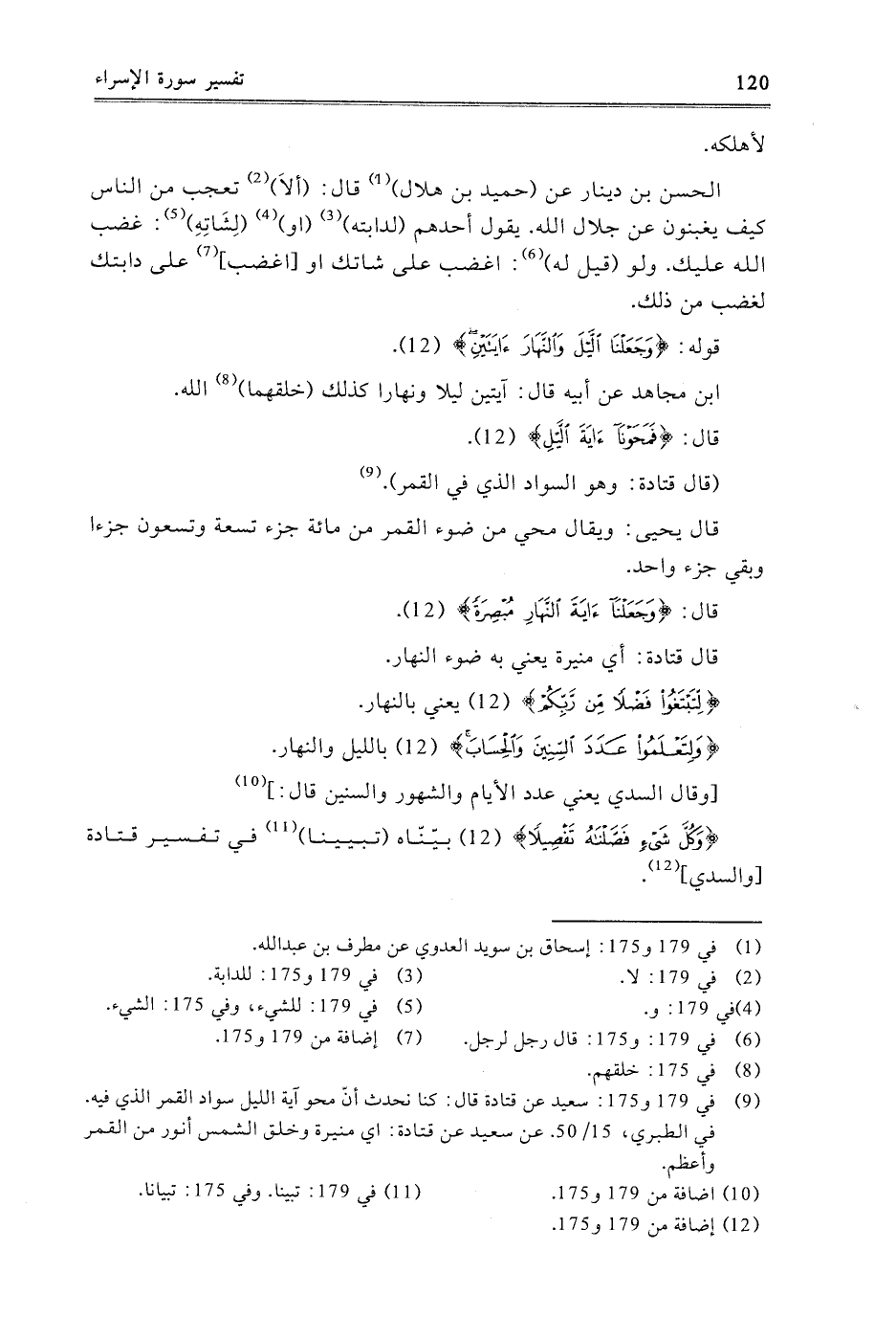قَالَ: {وَجَعَلْنَا آيَةَ النَّهَارِ مُبْصِرَةً} [الإسراء: 12] قَالَ قَتَادَةُ: أَيْ: مُنِيرَةٌ، يَعْنِي بِهِ: ضَوْءَ النَّهَارِ.