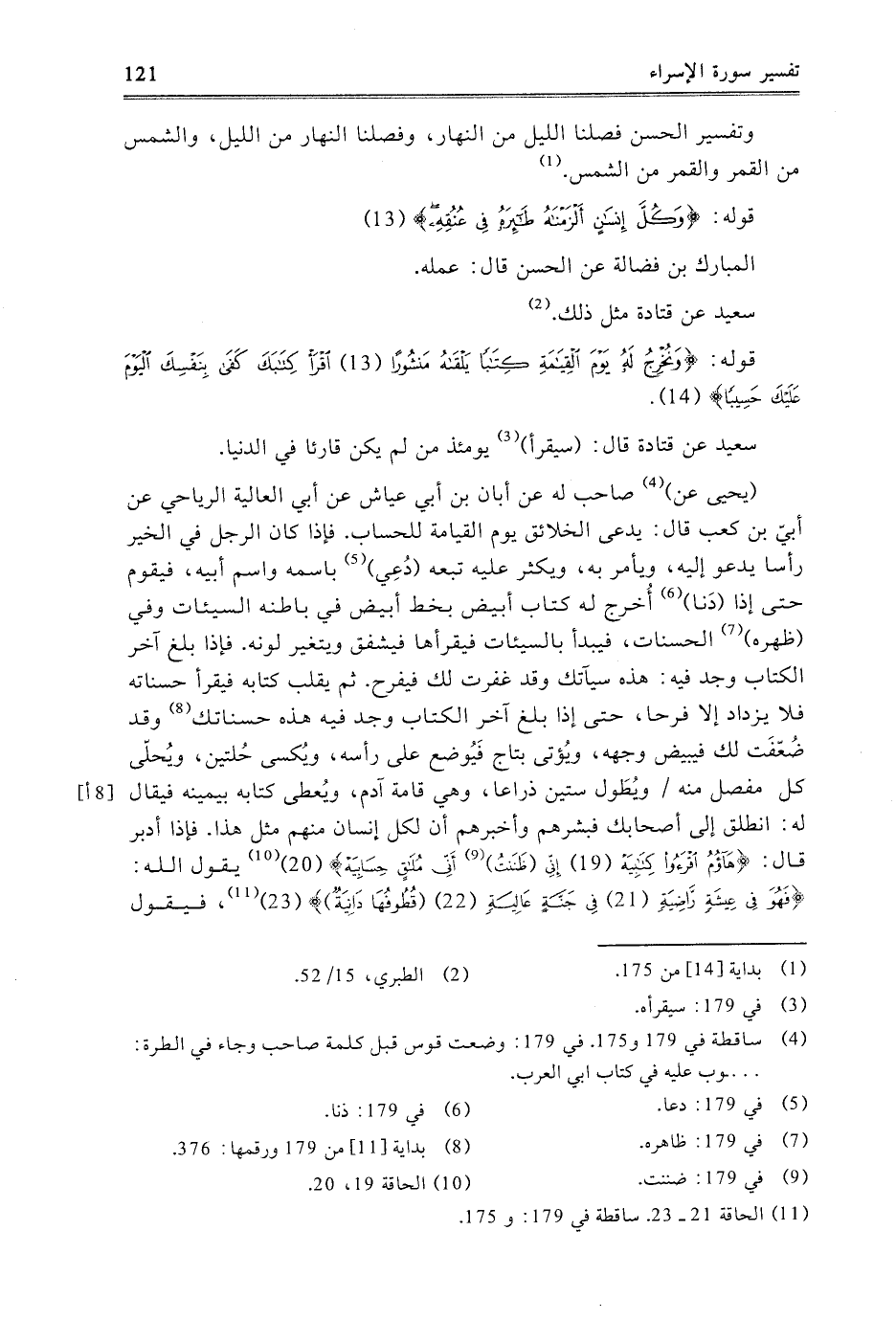 قَوْلُهُ: {وَكُلَّ إِنْسَانٍ أَلْزَمْنَاهُ طَائِرَهُ فِي عُنُقِهِ} [الإسراء: 13] الْمُبَارَكُ بْنُ فَضَالَةَ عَنِ الْحَسَنِ قَالَ: عَمَلَهُ.