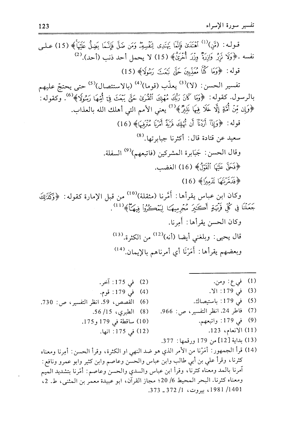 {فَدَمَّرْنَاهَا تَدْمِيرًا} [الإسراء: 16] وَكَانَ ابْنُ عَبَّاسٍ يَقْرَأُهَا: أَمَّرنا مُثَقَّلَةً، مِنْ قِبَلِ الإِمَارَةِ، كَقَوْلِهِ: {وَكَذَلِكَ جَعَلْنَا فِي كُلِّ قَرْيَةٍ أَكَابِرَ مُجْرِمِيهَا لِيَمْكُرُوا فِيهَا} [الأنعام: 123] وَكَانَ الْحَسَنُ يَقْرَأُهَا: أَمِرنا.