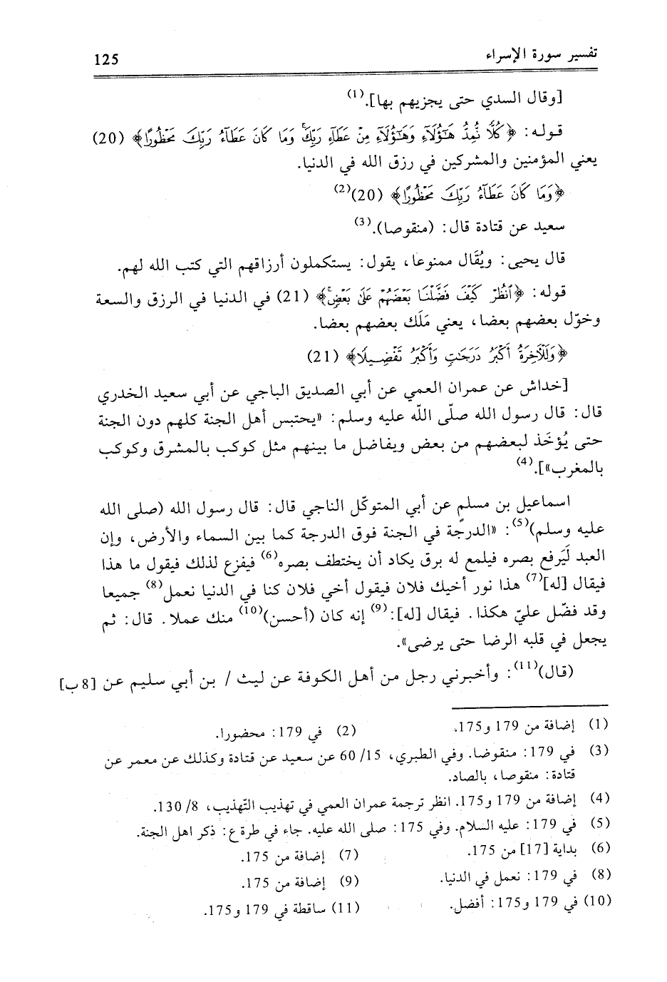 - إِسْمَاعِيلُ بْنُ مُسْلِمٍ، عَنْ أَبِي الْمُتَوَكِّلِ النَّاجِيِّ، قَالَ: قَالَ رَسُولُ اللَّهِ صَلَّى اللَّهُ عَلَيْهِ وَسَلَّمَ: " الدَّرَجَةُ فِي الْجَنَّةِ فَوْقَ الدَّرَجَةِ كَمَا بَيْنَ السَّمَاءِ وَالأَرْضِ، وَإِنَّ الْعَبْدَ لَيَرْفَعُ بَصَرَهُ فَيَلْمَعُ لَهُ بَرْقٌ يَكَادُ أَنْ يَخْتَلِفَ بَصَرُهُ، فَيُفْزَعُ لِذَلِكَ، فَيَقُولُ: مَا هَذَا؟ فَيُقَالُ لَهُ: هَذَا نُورُ أَخِيكَ فُلانٍ، فَيَقُولُ: أَخِي فُلانٌ، كُنَّا فِي الدُّنْيَا نَعْمَلُ جَمِيعًا وَقَدْ فُضِّلَ عَلَيَّ هَكَذَا، فَيُقَالُ لَهُ: إِنَّهُ كَانَ أَحْسَنَ