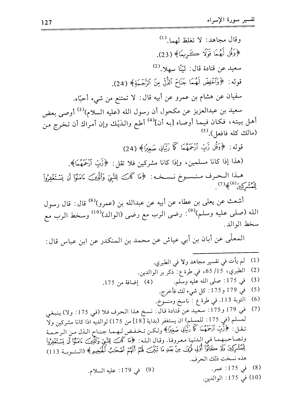 قَوْلُهُ: {وَقُلْ رَبِّ ارْحَمْهُمَا كَمَا رَبَّيَانِي صَغِيرًا} [الإسراء: 24] هَذَا إِذَا كَانَا مُسْلِمَيْنِ، وَإِذَا كَانَا مُشْرِكَيْنِ فَلا تَقُلْ: {رَبِّ ارْحَمْهُمَا} [الإسراء: 24] .