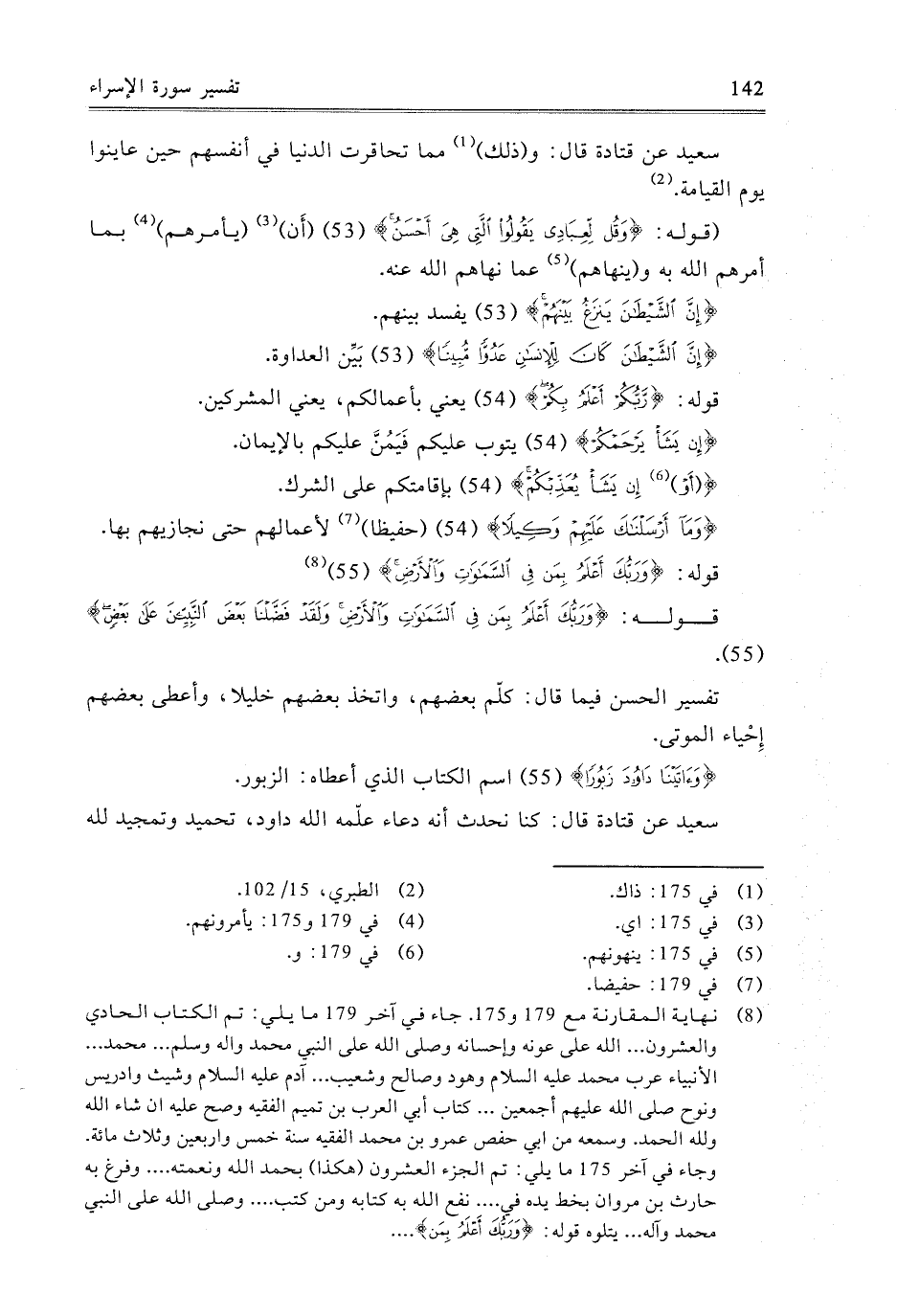 قَوْلُهُ: {وَرَبُّكَ أَعْلَمُ بِمَنْ فِي السَّمَوَاتِ وَالأَرْضِ وَلَقَدْ فَضَّلْنَا بَعْضَ النَّبِيِّينَ عَلَى بَعْضٍ} [الإسراء: 55] تَفْسِيرُ الْحَسَنِ فِيمَا قَالَ: كَلَّمَ بَعْضَهُمْ، وَاتَّخَذَ بَعْضَهُمْ خَلِيلا، وَأَعْطَى بَعْضَهُمْ إِحْيَاءَ الْمَوْتَى.