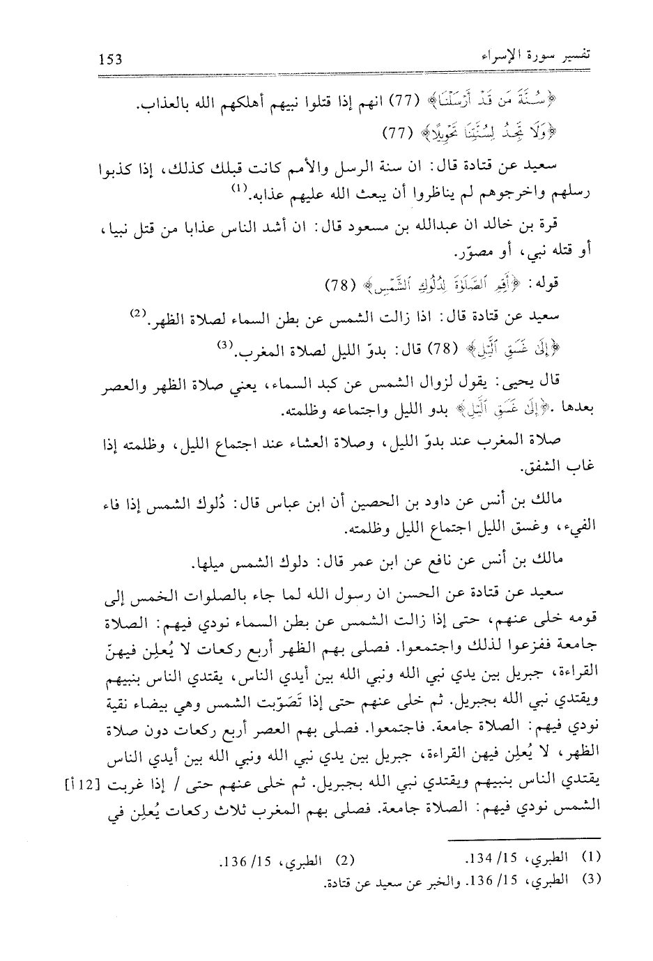 {وَلا تَجِدُ لِسُنَّتِنَا تَحْوِيلا} [الإسراء: 77] سَعِيدٌ، عَنْ قَتَادَةَ قَالَ: إِنَّ سُنَّةَ الرُّسُلِ وَالأُمَمِ كَانَتْ قَبْلَكَ كَذَلِكَ، إِذَا كَذَّبُوا رُسُلَهُمْ وَأَخْرَجُوهُمْ لَمْ يُنَاظَرُوا أَنْ يَبْعَثَ اللَّهُ عَلَيْهِمْ عَذَابَهُ.