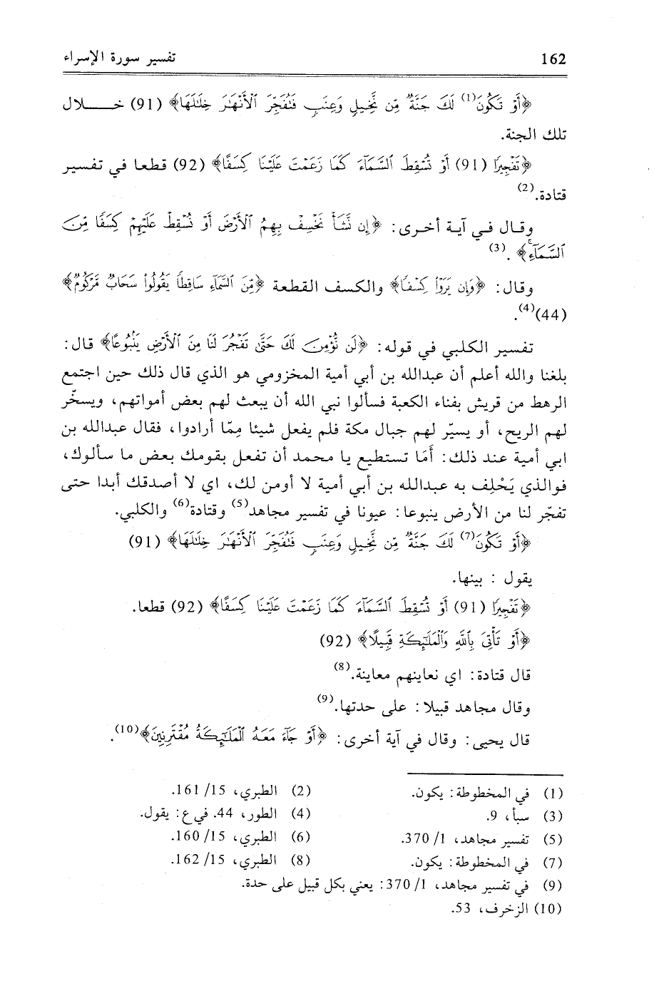 تَفْسِيرُ الْكَلْبِيِّ فِي قَوْلِهِ: {لَنْ نُؤْمِنَ لَكَ حَتَّى تَفْجُرَ لَنَا مِنَ الأَرْضِ يَنْبُوعًا} [الإسراء: 90] ، قَالَ: بَلَغَنَا، وَاللَّهُ أَعْلَمُ، أَنَّ عَبْدَ اللَّهِ بْنَ أَبِي أُمَيَّةَ الْمَخْزُومِيَّ هُوَ الَّذِي قَالَ ذَلِكَ حِينَ اجْتَمَعَ الرَّهْطُ مِنْ قُرَيْشٍ بِفِنَاءِ الْكَعْبَةِ فَسَأَلُوا نَبِيَّ اللَّهِ أَنْ يَبْعَثَ لَهُمْ بَعْضَ أَمْوَاتِهِمْ، وَيُسَخِّرَ لَهُمُ الرِّيحَ، أَوْ يُسَيِّرَ لَهُمْ جِبَالَ مَكَّةَ، فَلَمْ يَفْعَلْ شَيْئًا مِمَّا أَرَادُوا، فَقَالَ عَبْدُ اللَّهِ بْنُ أَبِي أُمَيَّةَ عِنْدَ ذَلِكَ: أَمَا