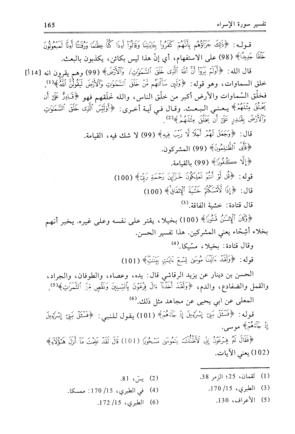 قَالَ اللَّهُ: {أَوَلَمْ يَرَوْا أَنَّ اللَّهَ الَّذِي خَلَقَ السَّمَوَاتِ وَالأَرْضَ} [الإسراء: 99] وَهُمْ يُقِرُّونَ أَنَّهُ خَلَقَ السَّمَوَاتِ، وَهُوَ قَوْلُهُ: {وَلَئِنْ سَأَلْتَهُمْ مَنْ خَلَقَ السَّمَوَاتِ وَالأَرْضَ لَيَقُولُنَّ اللَّهُ} [لقمان: 25] .