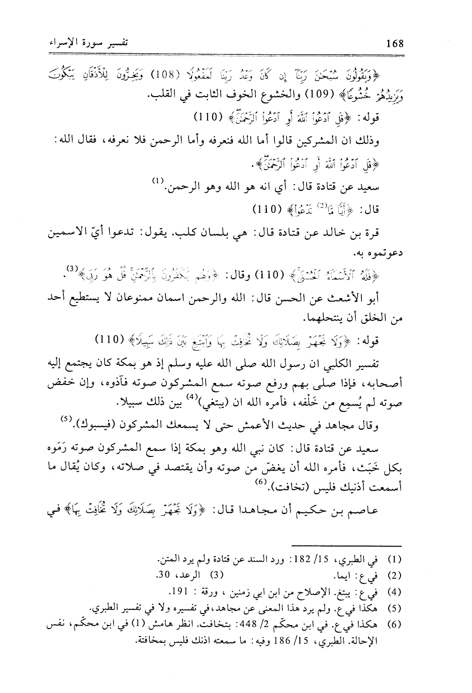 قَوْلُهُ: {قُلِ ادْعُوا اللَّهَ أَوِ ادْعُوا الرَّحْمَنَ} [الإسراء: 110] وَذَلِكَ أَنَّ الْمُشْرِكِينَ قَالُوا: أَمَّا اللَّهُ فَنَعْرِفُهُ، وَأَمَّا الرَّحْمَنُ فَلا نَعْرِفُهُ، فَقَالَ اللَّهُ: {قُلِ ادْعُوا اللَّهَ أَوِ ادْعُوا الرَّحْمَنَ} [الإسراء: 110] .