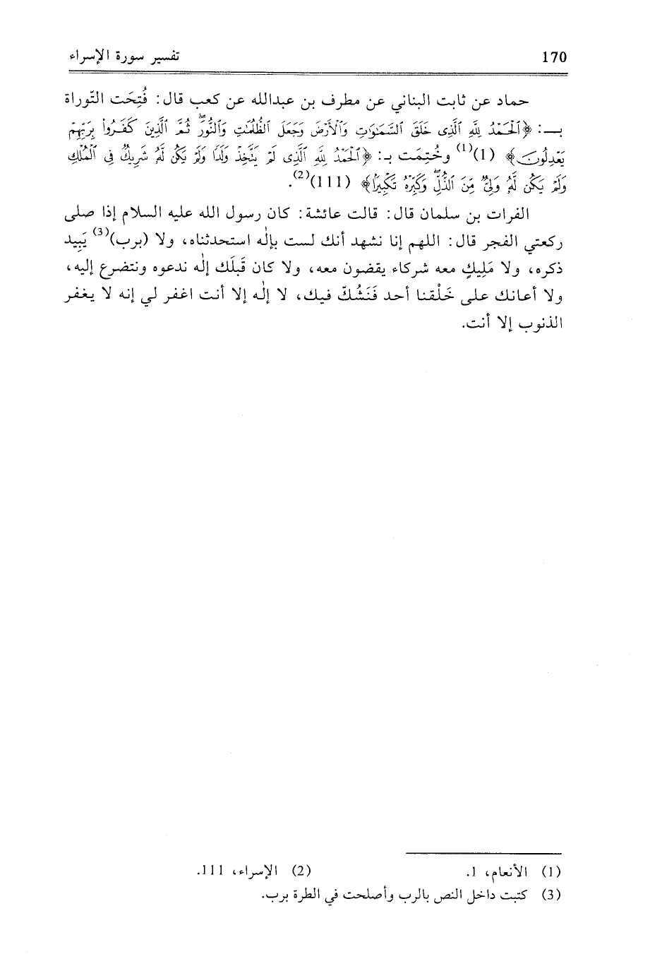 حَمَّادٌ، عَنْ ثَابِتٍ الْبُنَانِيِّ، عَنْ مُطَرِّفِ بْنِ عَبْدِ اللَّهِ، عَنْ كَعْبٍ، قَالَ: فُتِحَتِ التَّوْرَاةُ بـ: {الْحَمْدُ لِلَّهِ الَّذِي خَلَقَ السَّمَوَاتِ وَالأَرْضَ وَجَعَلَ الظُّلُمَاتِ وَالنُّورَ ثُمَّ الَّذِينَ كَفَرُوا بِرَبِّهِمْ يَعْدِلُونَ} [الأنعام: 1] ، وَخُتِمَتْ بـ: {الْحَمْدُ لِلَّهِ الَّذِي لَمْ يَتَّخِذْ وَلَدًا وَلَمْ يَكُنْ لَهُ شَرِيكٌ فِي الْمُلْكِ وَلَمْ يَكُنْ لَهُ وَلِيٌّ مِنَ الذُّلِّ وَكَبِّرْهُ تَكْبِيرًا} [الإسراء: 111] .