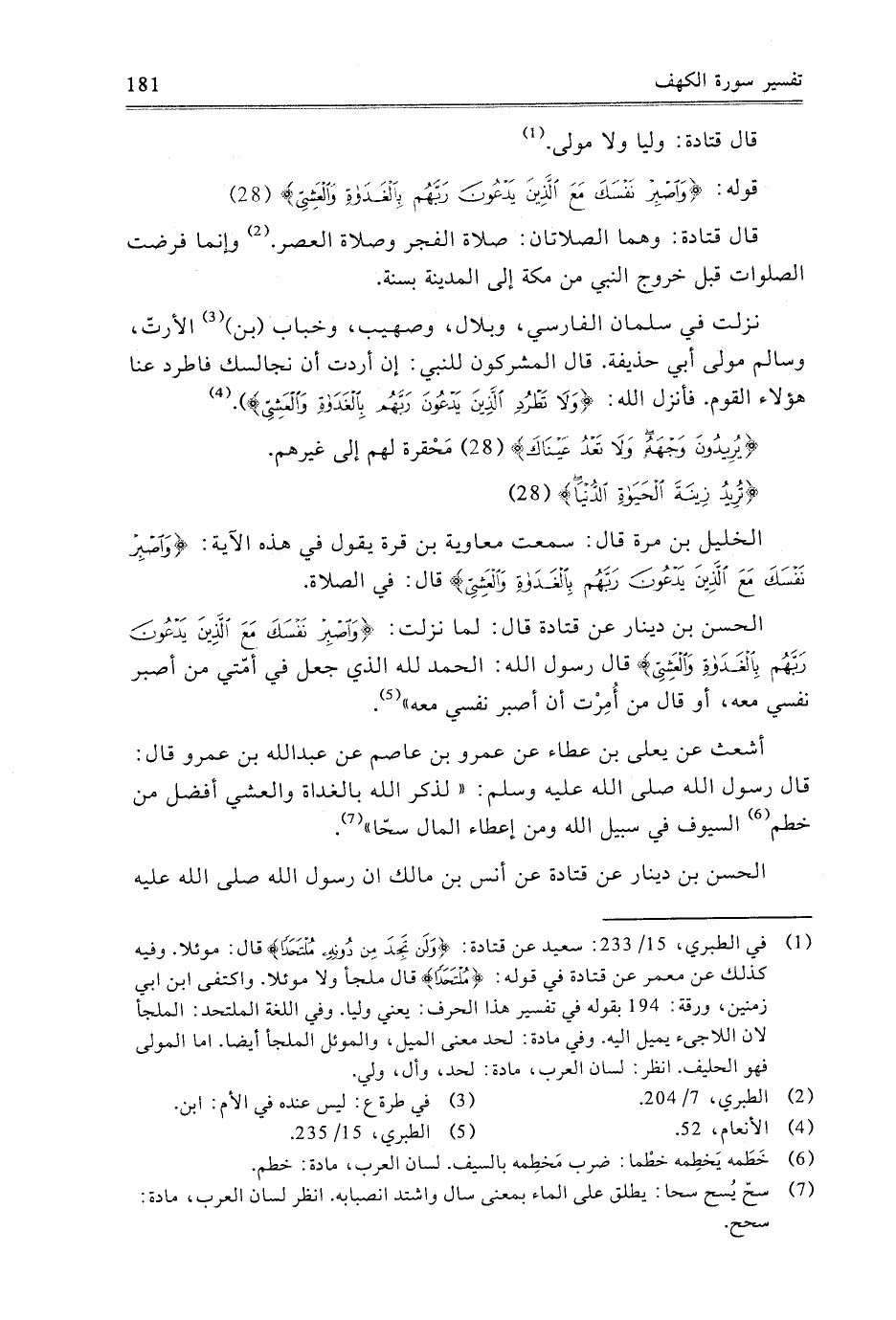 قَوْلُهُ: {وَاصْبِرْ نَفْسَكَ مَعَ الَّذِينَ يَدْعُونَ رَبَّهُمْ بِالْغَدَاةِ وَالْعَشِيِّ} [الكهف: 28] قَالَ قَتَادَةُ: وَهُمَا الصَّلاتَانِ: صَلاةُ الْفَجْرِ وَصَلاةُ الْعَصْرِ.