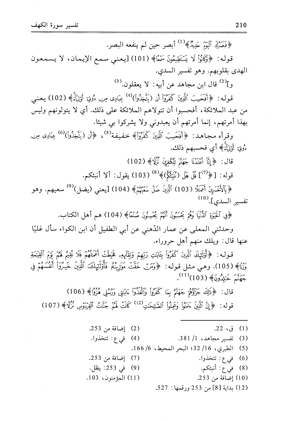 قَوْلُهُ: {أُولَئِكَ الَّذِينَ كَفَرُوا بِآيَاتِ رَبِّهِمْ وَلِقَائِهِ فَحَبِطَتْ أَعْمَالُهُمْ فَلا نُقِيمُ لَهُمْ يَوْمَ الْقِيَامَةِ وَزْنًا} [الكهف: 105] وَهِيَ مِثْلُ قَوْلِهِ: {وَمَنْ خَفَّتْ مَوَازِينُهُ فَأُولَئِكَ الَّذِينَ خَسِرُوا أَنْفُسَهُمْ فِي جَهَنَّمَ خَالِدُونَ} [المؤمنون: 103] قَالَ: {ذَلِكَ جَزَاؤُهُمْ جَهَنَّمُ بِمَا كَفَرُوا وَاتَّخَذُوا آيَاتِي وَرُسُلِي هُزُوًا} [الكهف: 106] قَوْلُهُ: {إِنَّ الَّذِينَ آمَنُوا وَعَمِلُوا الصَّالِحَاتِ كَانَتْ لَهُمْ جَنَّاتُ الْفِرْدَوْسِ نُزُلا} [الكهف: 107]