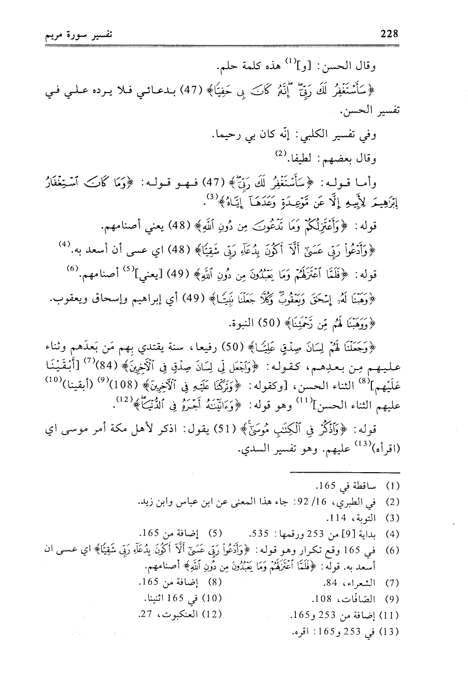 وَأَمَّا قَوْلُهُ: {سَأَسْتَغْفِرُ لَكَ رَبِّي} [مريم: 47] فَهُوَ قَوْلُهُ: {وَمَا كَانَ اسْتِغْفَارُ إِبْرَاهِيمَ لأَبِيهِ إِلا عَنْ مَوْعِدَةٍ وَعَدَهَا إِيَّاهُ} [التوبة: 114] قَوْلُهُ: {وَأَعْتَزِلُكُمْ وَمَا تَدْعُونَ مِنْ دُونِ اللَّهِ} [مريم: 48] يَعْنِي أَصْنَامَهُمْ.