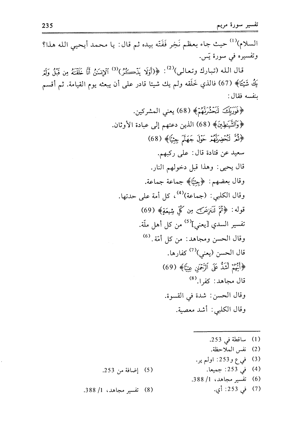 {ثُمَّ لَنُحْضِرَنَّهُمْ حَوْلَ جَهَنَّمَ جِثِيًّا} [مريم: 68] سَعِيدٌ، عَنْ قَتَادَةَ قَالَ: عَلَى رُكَبِهِمْ.