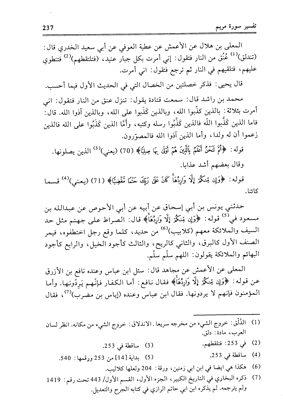 - حَدَّثَنِي يُونُسُ بْنُ أَبِي إِسْحَاقَ، عَنْ أَبِيهِ، عَنْ أَبِي الأَحْوَصِ، عَنْ عَبْدِ اللَّهِ بْنِ مَسْعُودٍ فِي قَوْلِهِ: {وَإِنْ مِنْكُمْ إِلا وَارِدُهَا} [مريم: 71] قَالَ: الصِّرَاطُ عَلَى جَهَنَّمَ مِثْلُ حَدِّ السَّيْفِ، وَالْمَلائِكَةُ مَعَهُمْ كَلابِيبُ مِنْ حَدِيدٍ، كُلَّمَا وَقَعَ رَجُلٌ اخْتَطَفُوهُ، فَيَمُرُّ الصِّنْفُ الأَوَّلُ كَالْبَرْقِ، وَالثَّانِي كَالرِّيحِ، وَالثَّالِثُ كَأَجْوَدِ الْخَيْلِ، وَالرَّابِعُ كَأَجْوَدِ الْبَهَائِمِ، وَالْمَلائِكَةُ يَقُولُونَ: اللَّهُمَّ سَلِّمْ سَلِّمْ.