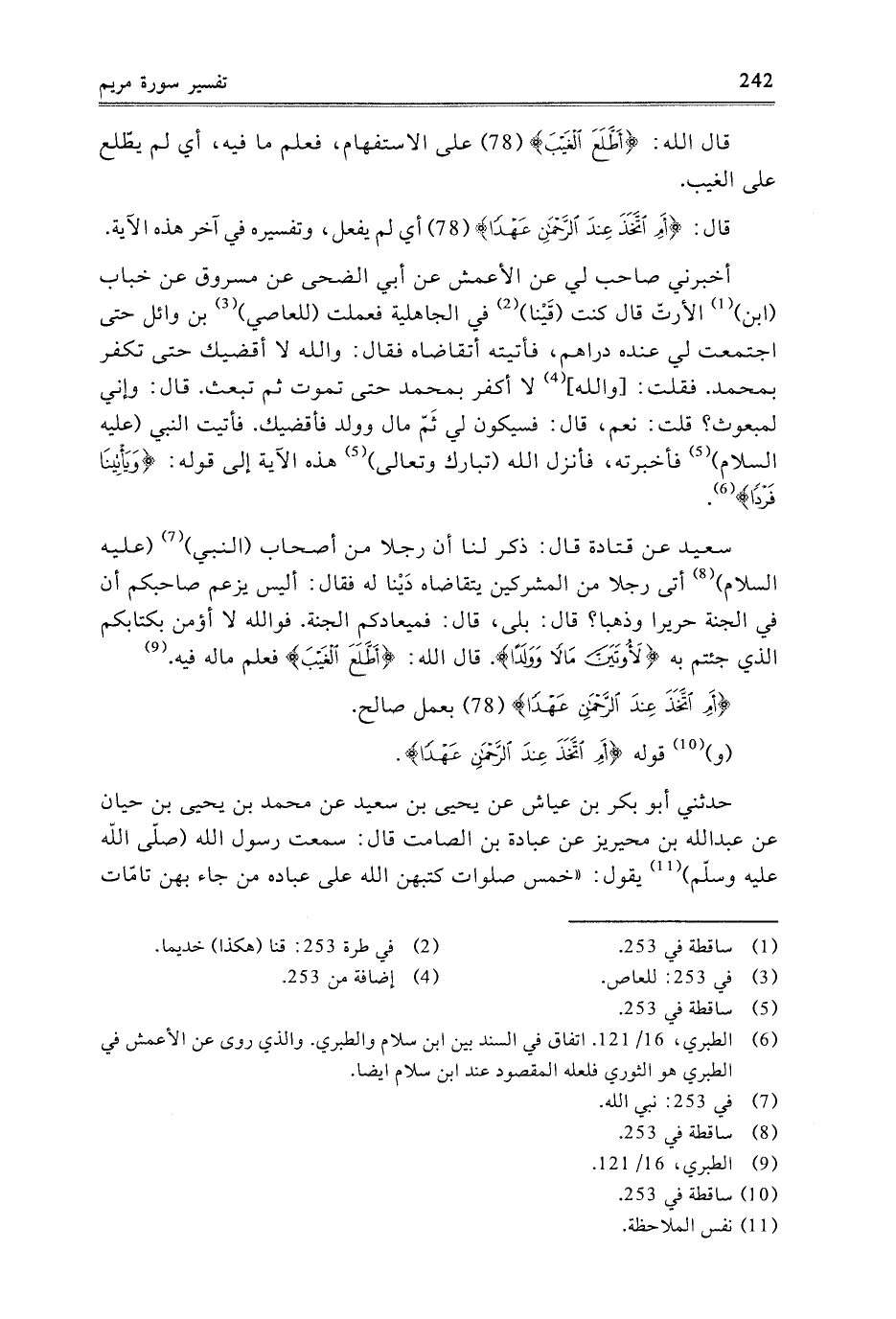 - أَخْبَرَنِي صَاحِبٌ لِي، عَنِ الأَعْمَشِ، عَنْ أَبِي الضُّحَى، عَنْ مَسْرُوقٍ، عَنْ خَبَّابِ بْنِ الأَرَتِّ قَالَ: كُنْتُ قَيْنًا فِي الْجَاهِلِيَّةِ فَعَمِلْتُ لِلْعَاصِي بْنِ وَائِلٍ حَتَّى اجْتَمَعَتْ لِي عِنْدَهُ دَرَاهِمُ، فَأَتَيْتُهُ أَتَقَاضَاهُ فَقَالَ: وَاللَّهِ لا أَقْضِيكَ حَتَّى تَكْفُرَ بِمُحَمَّدٍ.
