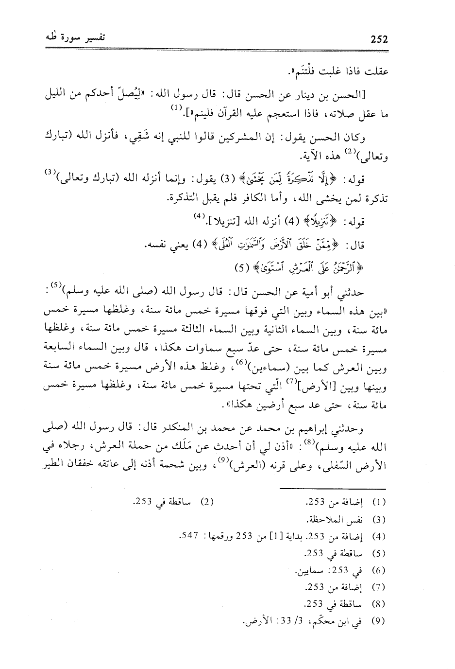 - حَدَّثَنِي أَبُو أُمَيَّةَ، عَنِ الْحَسَنِ قَالَ: قَالَ رَسُولُ اللَّهِ صَلَّى اللَّهُ عَلَيْهِ وَسَلَّمَ: " بَيْنَ هَذِهِ السَّمَاءِ وَبَيْنَ الَّتِي فَوْقَهَا مَسِيرَةُ خَمْسِ مِائَةِ سَنَةٍ، وَغِلَظُهَا مَسِيرَةُ خَمْسِ مِائَةِ سَنَةٍ، وَبَيْنَ السَّمَاءِ الثَّانِيَةِ وَبَيْنَ السَّمَاءِ الثَّالِثَةِ مَسِيرَةُ خَمْسِ مِائَةِ سَنَةٍ، وَغِلَظُهَا مَسِيرَةُ خَمْسِ مِائَةِ سَنَةٍ، حَتَّى عَدَّ سَبْعَ سَمَوَاتٍ هَكَذَا، قَالَ: وَبَيْنَ السَّمَاءِ السَّابِعَةِ وَبَيْنَ الْعَرْشِ كَمَا بَيْنَ سَمَاءَيْنِ، وَغِلَظُ هَذِهِ الأَرْضِ